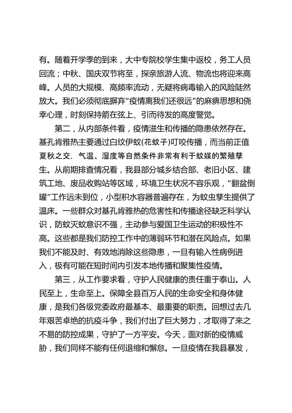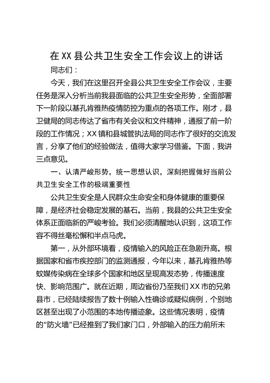 在XX縣公共衛(wèi)生安全工作會(huì)議上的講話同志們:今天,我們?cè)谶@里召開(kāi)全縣公共衛(wèi)生安全工作會(huì)議,主要任務(wù)是深入分析當(dāng)前我縣面臨的公共衛(wèi)生安全形勢(shì),全面部署下一階段以基孔肯雅熱疫情防控為重點(diǎn)的各項(xiàng)工作。剛才,縣衛(wèi)健局的同志傳達(dá)了省市有關(guān)會(huì)議和文件精神,通報(bào)了前一階段的工作情況;XX鎮(zhèn)和縣城管執(zhí)法局的同志作了很好的交流發(fā)言,分享了他們的經(jīng)驗(yàn)做法,值得大家學(xué)習(xí)借鑒。下面,我講三點(diǎn)意見(jiàn)。一、認(rèn)清嚴(yán)峻形勢(shì),統(tǒng)一思想認(rèn)識(shí),深刻把握做好當(dāng)前公共衛(wèi)生安全工作的極端重要性公共衛(wèi)生安全是人民群眾生命安全和身體健康的重要保障,是經(jīng)濟(jì)社會(huì)穩(wěn)定發(fā)展的基石。當(dāng)前...