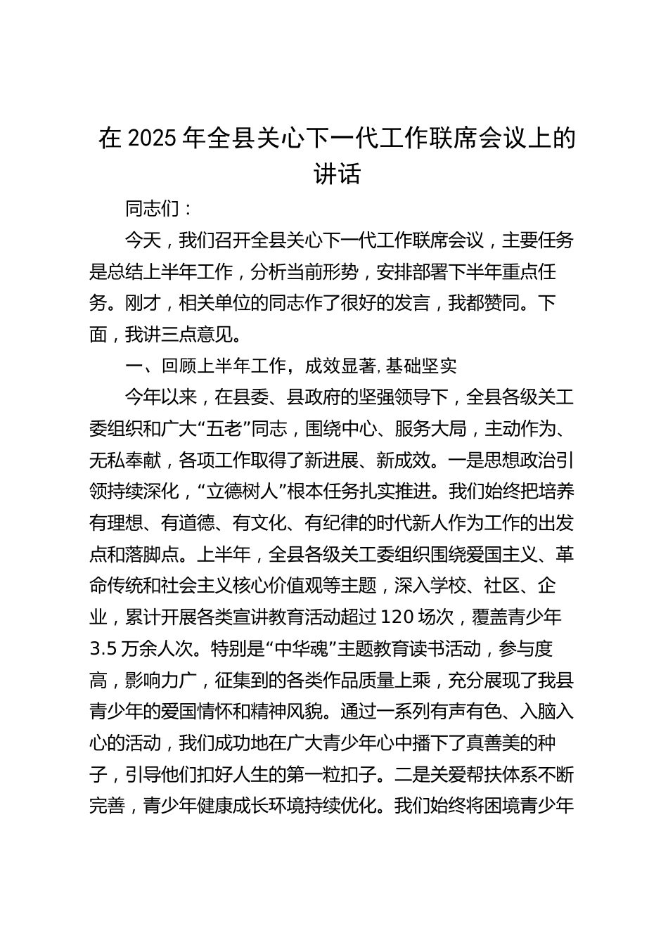 在2025年全縣關心下一代工作聯(lián)席會議上的講話同志們:今天,我們召開全縣關心下一代工作聯(lián)席會議,主要任務是總結上半年工作,分析當前形勢,安排部署下半年重點任務。剛才,相關單位的同志作了很好的發(fā)言,我都贊同。下面,我講三點意見。一、回顧上半年工作,成效顯著,基礎堅實今年以來,在縣委、縣政府的堅強領導下,全縣各級關工“”委組織和廣大五老同志,圍繞中心、服務大局,主動作為、無私奉獻,各項工作取得了新進展、新成效。一是思想政治引“”領持續(xù)深化,立德樹人根本任務扎實推進。我們始終把培養(yǎng)有理想、有道德、有文化、有紀律的時代新人作為工作的出發(fā)...