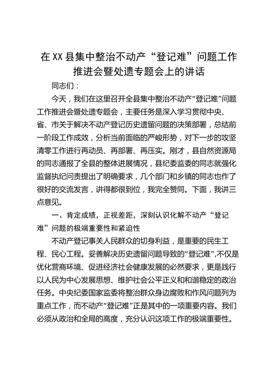在XX縣集中整治不動產(chǎn)“登記難”問題工作推進會暨處遺專題會上的講話同志們:“”今天,我們在這里召開全縣集中整治不動產(chǎn)登記難問題工作推進會暨處遺專題會,主要任務(wù)是深入學(xué)習(xí)貫徹中央、省、市關(guān)于解決不動產(chǎn)登記歷史遺留問題的決策部署,總結(jié)前一階段工作成效,分析當(dāng)前面臨的嚴峻形勢,對下一步的攻堅清零工作進行再動員、再部署、再壓實。剛才,縣自然資源局的同志通報了全縣的整體進展情況,縣紀委監(jiān)委的同志就強化監(jiān)督執(zhí)紀問責(zé)提出了明確要求,幾個部門和鄉(xiāng)鎮(zhèn)的同志也作了很好的交流發(fā)言,講得都很到位,我完全贊同。下面,我講三點意見。一、肯定成績,正視差距...