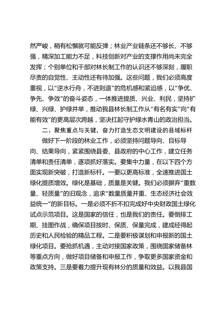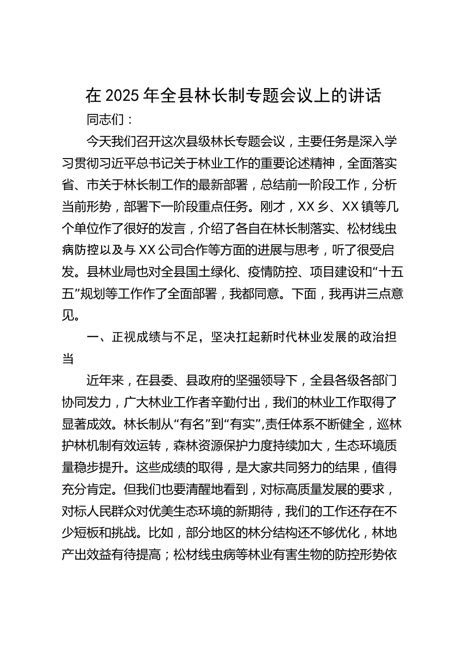 在2025年全縣林長制專題會議上的講話同志們:今天我們召開這次縣級林長專題會議,主要任務(wù)是深入學(xué)習(xí)貫徹習(xí)近平總書記關(guān)于林業(yè)工作的重要論述精神,全面落實省、市關(guān)于林長制工作的最新部署,總結(jié)前一階段工作,分析當(dāng)前形勢,部署下一階段重點任務(wù)。剛才,XX鄉(xiāng)、XX鎮(zhèn)等幾個單位作了很好的發(fā)言,介紹了各自在林長制落實、松材線蟲病防控以及與XX公司合作等方面的進(jìn)展與思考,聽了很受啟“發(fā)。縣林業(yè)局也對全縣國土綠化、疫情防控、項目建設(shè)和十五”五規(guī)劃等工作作了全面部署,我都同意。下面,我再講三點意見。一、正視成績與不足,堅決扛起新時代林業(yè)發(fā)展的政治擔(dān)當(dāng)近年...