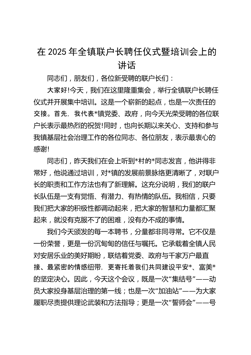 在2025年全鎮(zhèn)聯(lián)戶長(zhǎng)聘任儀式暨培訓(xùn)會(huì)上的講話