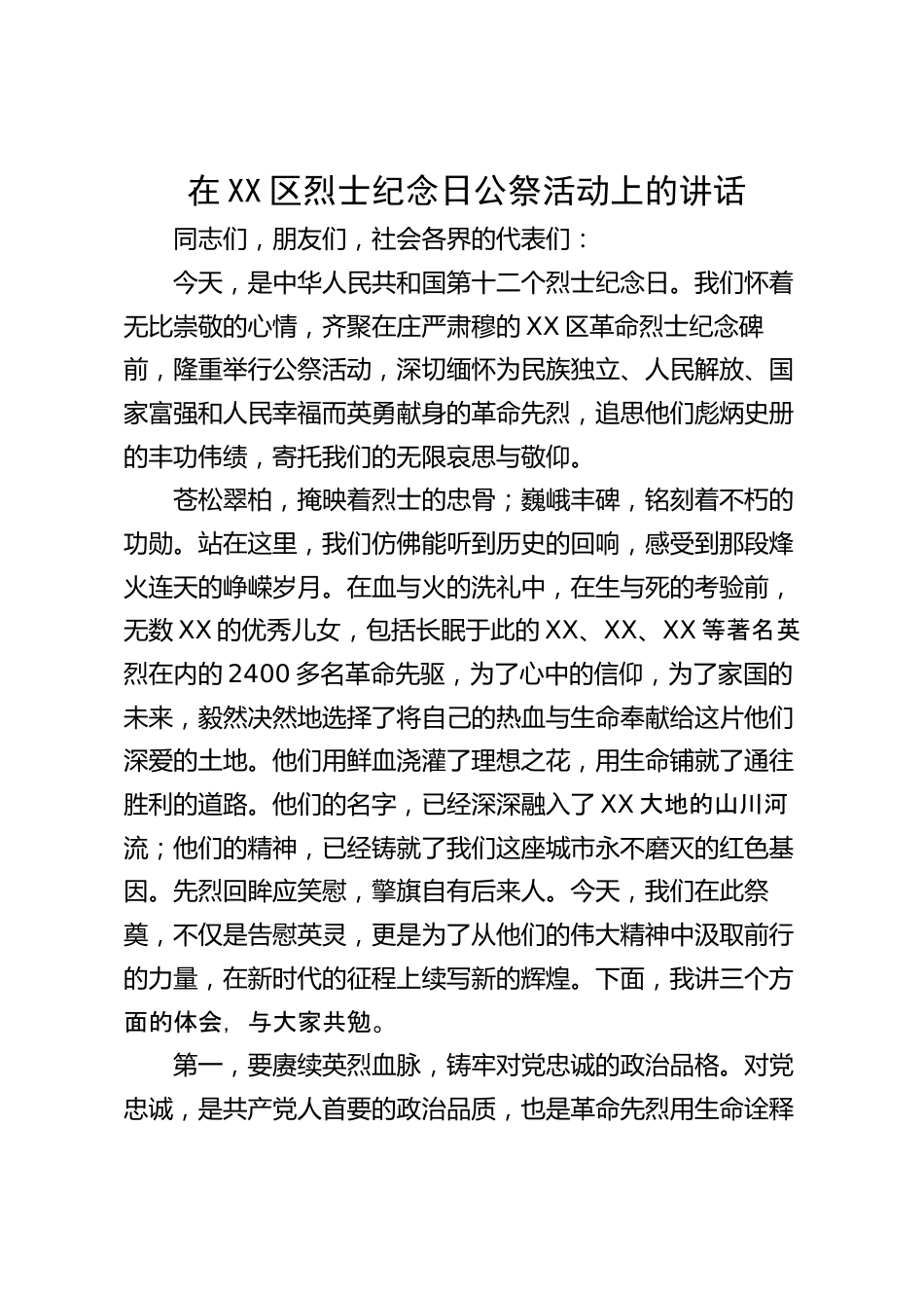 在XX區(qū)烈士紀念日公祭活動上的講話同志們,朋友們,社會各界的代表們:今天,是中華人民共和國第十二個烈士紀念日。我們懷著無比崇敬的心情,齊聚在莊嚴肅穆的XX區(qū)革命烈士紀念碑前,隆重舉行公祭活動,深切緬懷為民族獨立、人民解放、國家富強和人民幸福而英勇獻身的革命先烈,追思他們彪炳史冊的豐功偉績,寄托我們的無限哀思與敬仰。蒼松翠柏,掩映著烈士的忠骨;巍峨豐碑,銘刻著不朽的功勛。站在這里,我們仿佛能聽到歷史的回響,感受到那段烽火連天的崢嶸歲月。在血與火的洗禮中,在生與死的考驗前,無數(shù)XX的優(yōu)秀兒女,包括長眠于此的XX、XX、XX等著名英烈在內(nèi)的24...