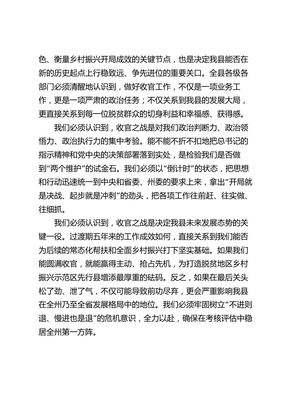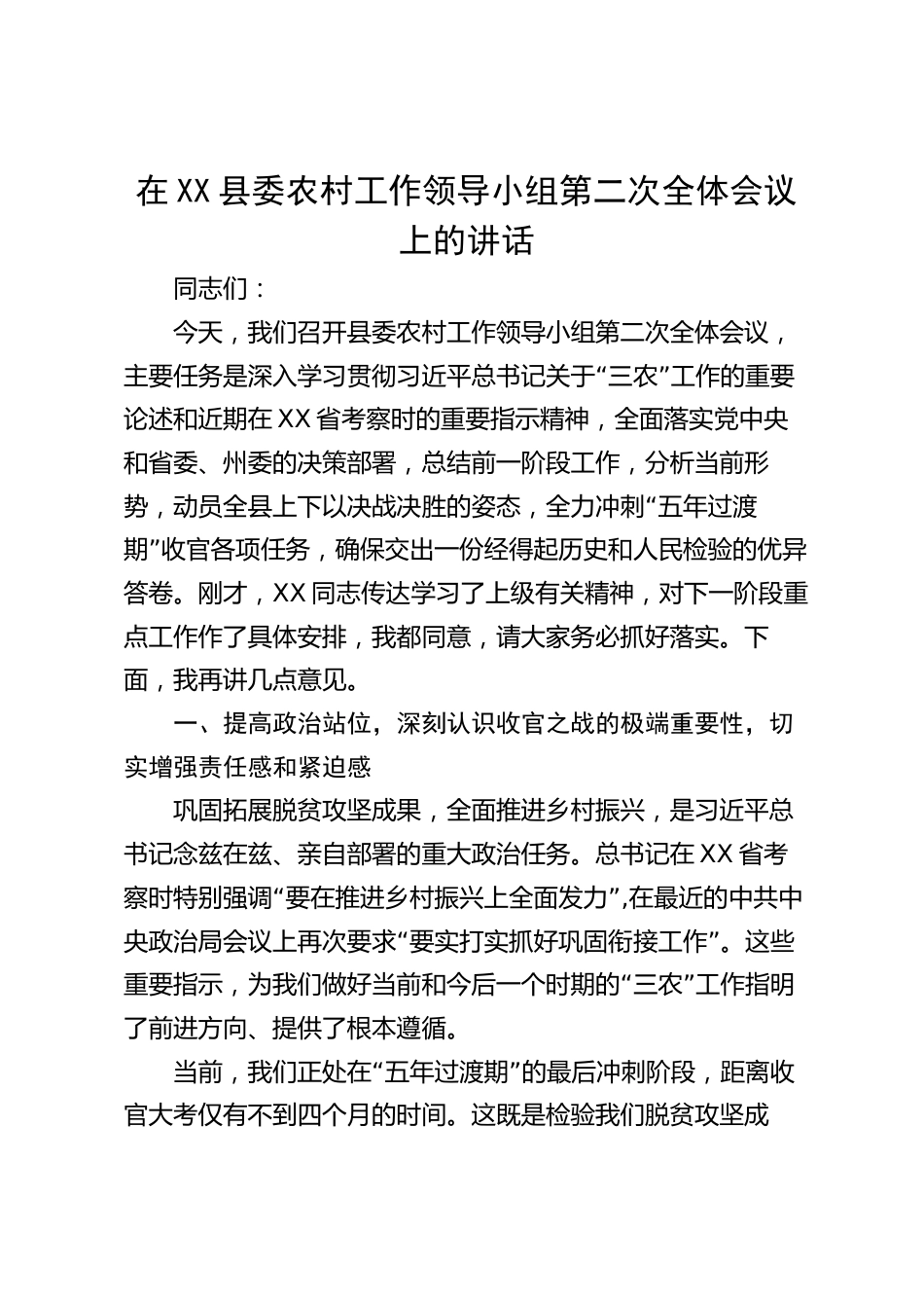 在XX縣委農(nóng)村工作領導小組第二次全體會議上的講話同志們:今天,我們召開縣委農(nóng)村工作領導小組第二次全體會議,“”主要任務是深入學習貫徹習近平總書記關于三農(nóng)工作的重要論述和近期在XX省考察時的重要指示精神,全面落實黨中央和省委、州委的決策部署,總結前一階段工作,分析當前形“勢,動員全縣上下以決戰(zhàn)決勝的姿態(tài),全力沖刺五年過渡”期收官各項任務,確保交出一份經(jīng)得起歷史和人民檢驗的優(yōu)異答卷。剛才,XX同志傳達學習了上級有關精神,對下一階段重點工作作了具體安排,我都同意,請大家務必抓好落實。下面,我再講幾點意見。一、提高政治站位,深刻認識收官之...