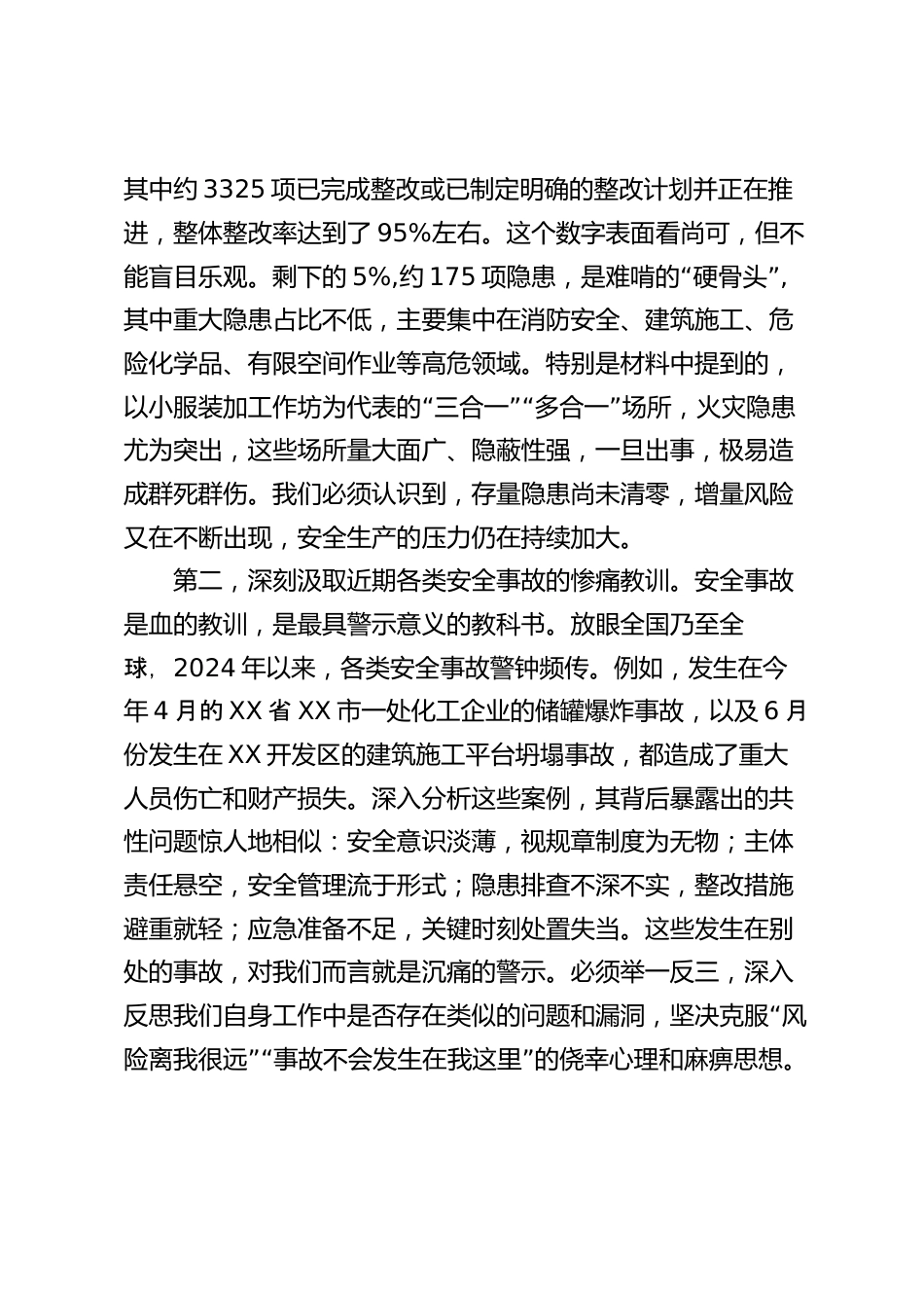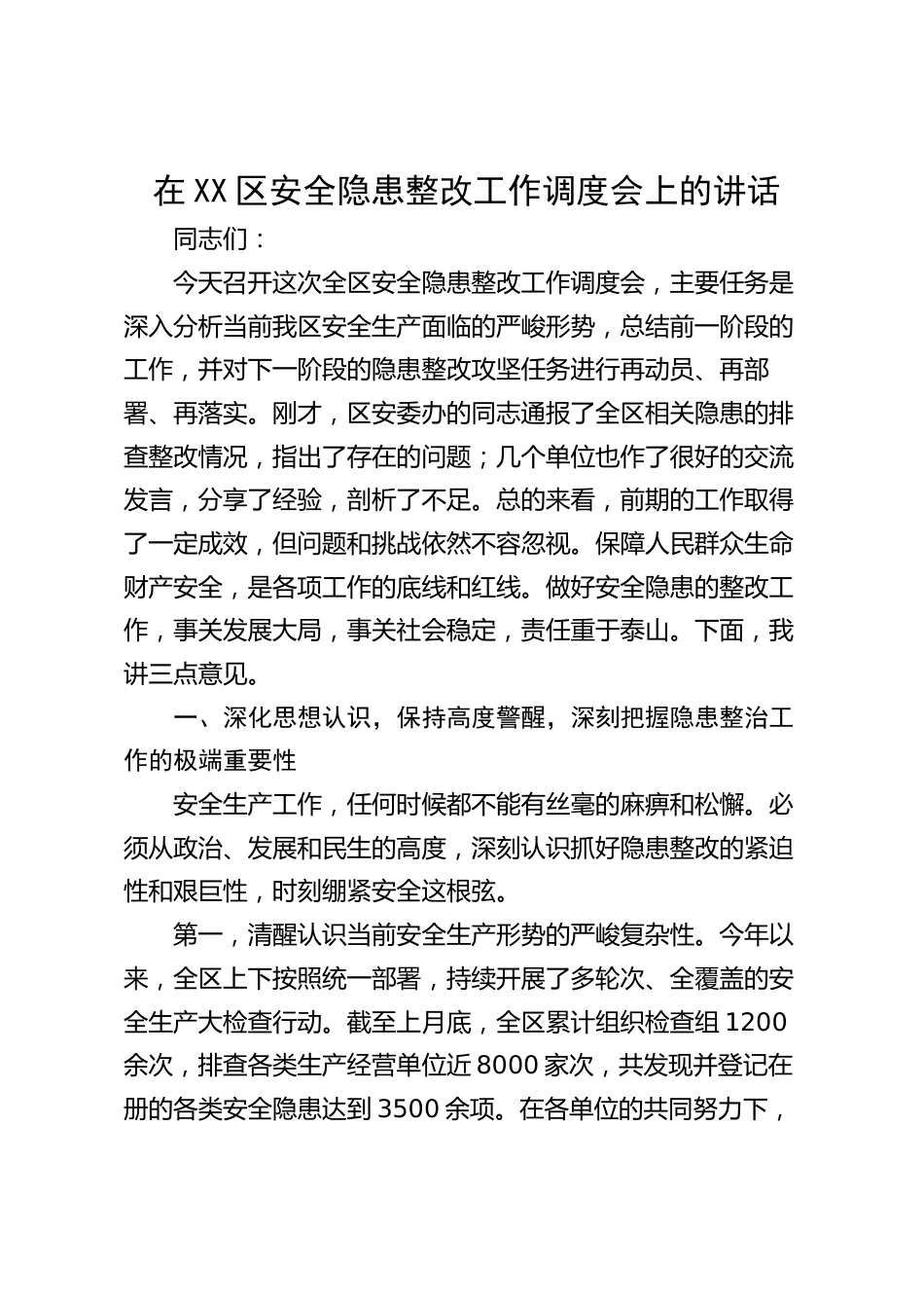 在XX區(qū)安全隱患整改工作調(diào)度會上的講話同志們:今天召開這次全區(qū)安全隱患整改工作調(diào)度會,主要任務(wù)是深入分析當(dāng)前我區(qū)安全生產(chǎn)面臨的嚴峻形勢,總結(jié)前一階段的工作,并對下一階段的隱患整改攻堅任務(wù)進行再動員、再部署、再落實。剛才,區(qū)安委辦的同志通報了全區(qū)相關(guān)隱患的排查整改情況,指出了存在的問題;幾個單位也作了很好的交流發(fā)言,分享了經(jīng)驗,剖析了不足。總的來看,前期的工作取得了一定成效,但問題和挑戰(zhàn)依然不容忽視。保障人民群眾生命財產(chǎn)安全,是各項工作的底線和紅線。做好安全隱患的整改工作,事關(guān)發(fā)展大局,事關(guān)社會穩(wěn)定,責(zé)任重于泰山。下面,我講三點...