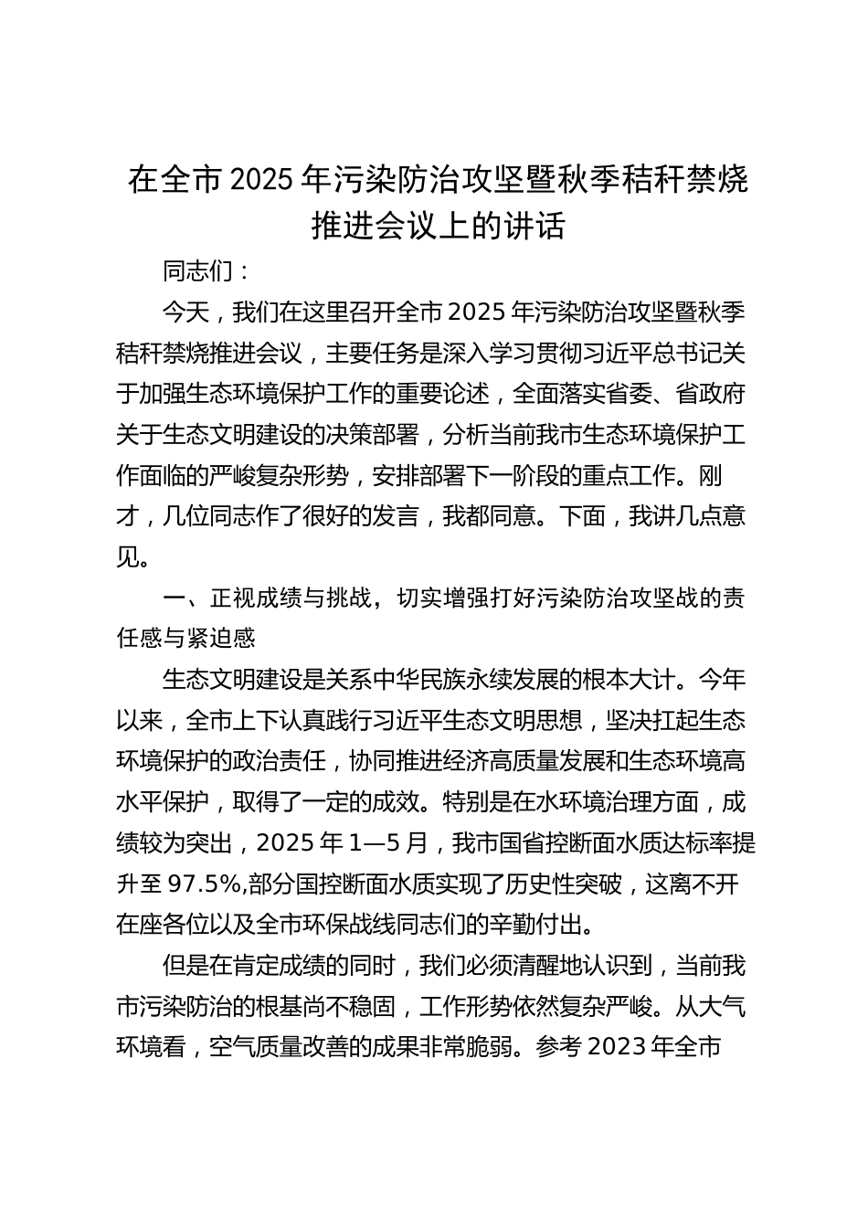 在全市2025年污染防治攻堅暨秋季秸稈禁燒推進會議上的講話