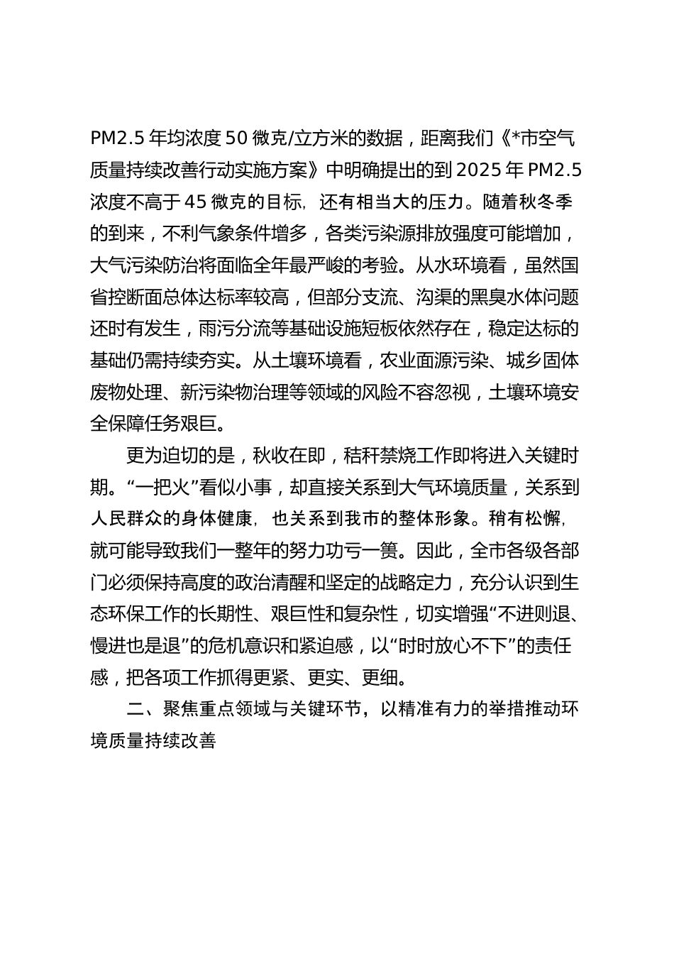 在全市2025年污染防治攻堅暨秋季秸稈禁燒推進會議上的講話同志們:今天,我們在這里召開全市2025年污染防治攻堅暨秋季秸稈禁燒推進會議,主要任務(wù)是深入學(xué)習(xí)貫徹習(xí)近平總書記關(guān)于加強生態(tài)環(huán)境保護工作的重要論述,全面落實省委、省政府關(guān)于生態(tài)文明建設(shè)的決策部署,分析當(dāng)前我市生態(tài)環(huán)境保護工作面臨的嚴(yán)峻復(fù)雜形勢,安排部署下一階段的重點工作。剛才,幾位同志作了很好的發(fā)言,我都同意。下面,我講幾點意見。一、正視成績與挑戰(zhàn),切實增強打好污染防治攻堅戰(zhàn)的責(zé)任感與緊迫感生態(tài)文明建設(shè)是關(guān)系中華民族永續(xù)發(fā)展的根本大計。今年以來,全市上下認(rèn)真踐行習(xí)近平生態(tài)文明...