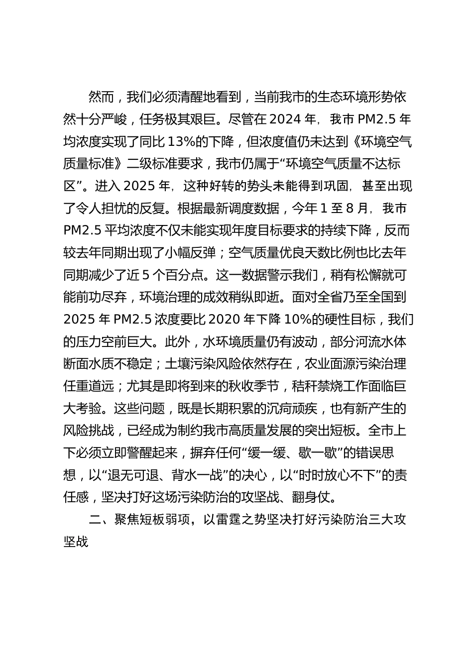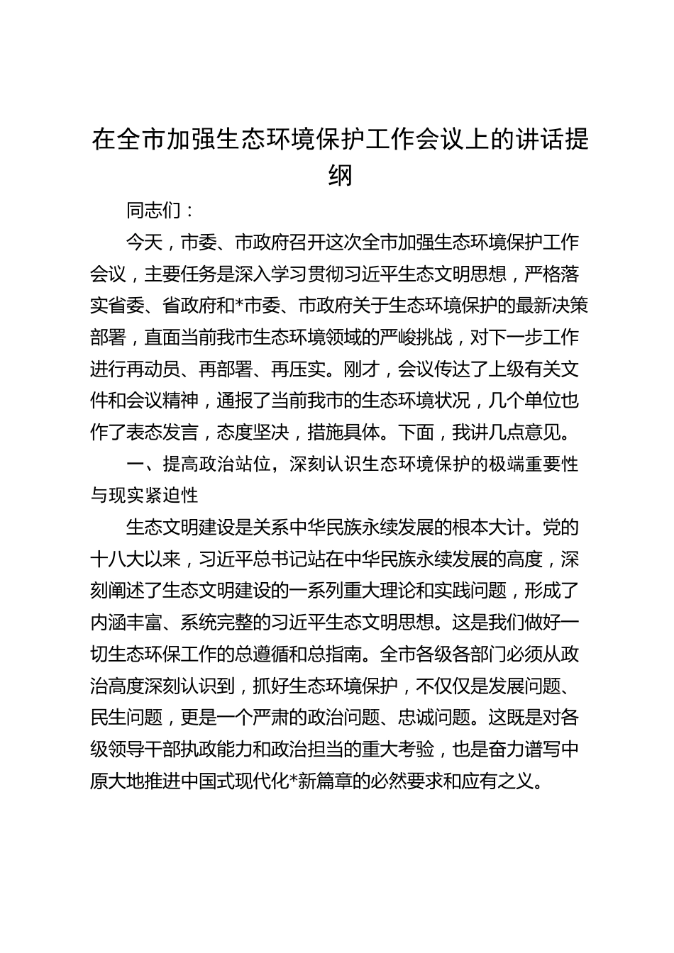 在全市加強(qiáng)生態(tài)環(huán)境保護(hù)工作會(huì)議上的講話提綱同志們:今天,市委、市政府召開這次全市加強(qiáng)生態(tài)環(huán)境保護(hù)工作會(huì)議,主要任務(wù)是深入學(xué)習(xí)貫徹習(xí)近平生態(tài)文明思想,嚴(yán)格落實(shí)省委、省政府和*市委、市政府關(guān)于生態(tài)環(huán)境保護(hù)的最新決策部署,直面當(dāng)前我市生態(tài)環(huán)境領(lǐng)域的嚴(yán)峻挑戰(zhàn),對(duì)下一步工作進(jìn)行再動(dòng)員、再部署、再壓實(shí)。剛才,會(huì)議傳達(dá)了上級(jí)有關(guān)文件和會(huì)議精神,通報(bào)了當(dāng)前我市的生態(tài)環(huán)境狀況,幾個(gè)單位也作了表態(tài)發(fā)言,態(tài)度堅(jiān)決,措施具體。下面,我講幾點(diǎn)意見。一、提高政治站位,深刻認(rèn)識(shí)生態(tài)環(huán)境保護(hù)的極端重要性與現(xiàn)實(shí)緊迫性生態(tài)文明建設(shè)是關(guān)系中華民族永續(xù)發(fā)展的根本大...