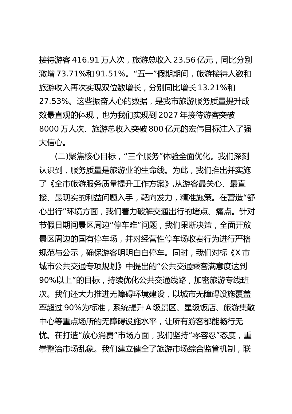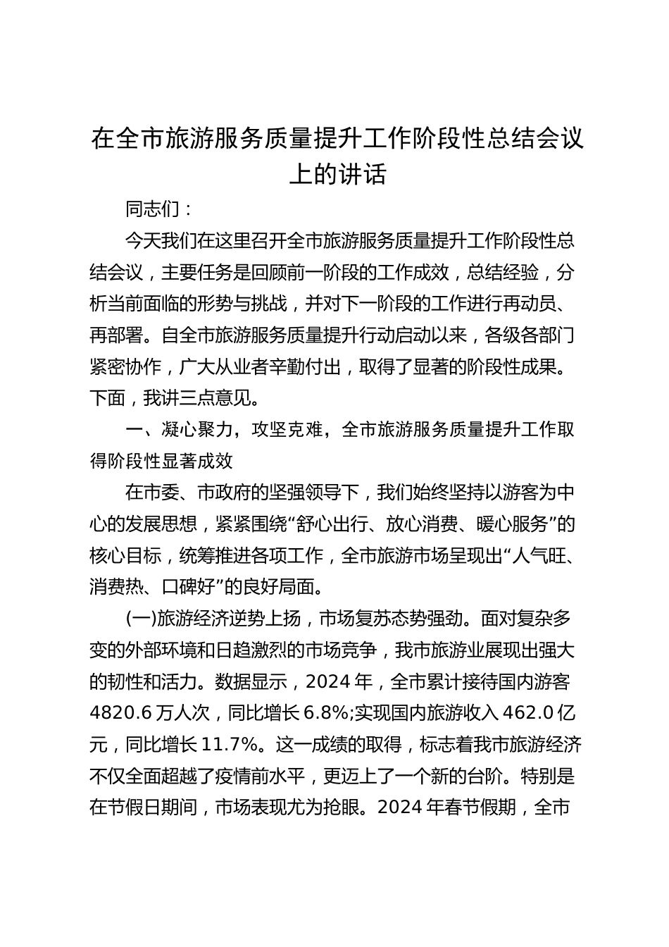 在全市旅游服務(wù)質(zhì)量提升工作階段性總結(jié)會議上的講話同志們:今天我們在這里召開全市旅游服務(wù)質(zhì)量提升工作階段性總結(jié)會議,主要任務(wù)是回顧前一階段的工作成效,總結(jié)經(jīng)驗,分析當(dāng)前面臨的形勢與挑戰(zhàn),并對下一階段的工作進行再動員、再部署。自全市旅游服務(wù)質(zhì)量提升行動啟動以來,各級各部門緊密協(xié)作,廣大從業(yè)者辛勤付出,取得了顯著的階段性成果。下面,我講三點意見。一、凝心聚力,攻堅克難,全市旅游服務(wù)質(zhì)量提升工作取得階段性顯著成效在市委、市政府的堅強領(lǐng)導(dǎo)下,我們始終堅持以游客為中“”心的發(fā)展思想,緊緊圍繞舒心出行、放心消費、暖心服務(wù)的“核心目標(biāo),統(tǒng)籌...