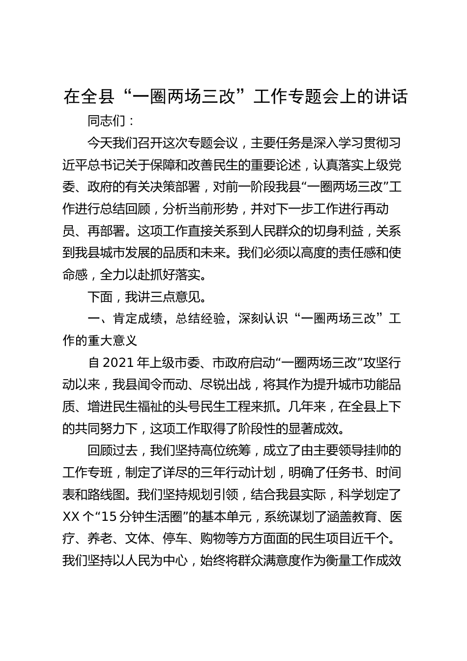 在全縣“一圈兩場(chǎng)三改”工作專(zhuān)題會(huì)上的講話(huà)同志們:今天我們召開(kāi)這次專(zhuān)題會(huì)議,主要任務(wù)是深入學(xué)習(xí)貫徹習(xí)近平總書(shū)記關(guān)于保障和改善民生的重要論述,認(rèn)真落實(shí)上級(jí)黨“”委、政府的有關(guān)決策部署,對(duì)前一階段我縣一圈兩場(chǎng)三改工作進(jìn)行總結(jié)回顧,分析當(dāng)前形勢(shì),并對(duì)下一步工作進(jìn)行再動(dòng)員、再部署。這項(xiàng)工作直接關(guān)系到人民群眾的切身利益,關(guān)系到我縣城市發(fā)展的品質(zhì)和未來(lái)。我們必須以高度的責(zé)任感和使命感,全力以赴抓好落實(shí)。下面,我講三點(diǎn)意見(jiàn)。一、肯定成績(jī),總結(jié)經(jīng)驗(yàn),深刻認(rèn)識(shí)“一圈兩場(chǎng)三改”工作的重大意義自2021“”年上級(jí)市委、市政府啟動(dòng)一圈兩場(chǎng)三改攻堅(jiān)行動(dòng)以來(lái)...