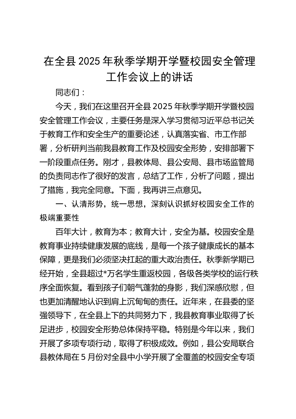 在全縣2025年秋季學(xué)期開學(xué)暨校園安全管理工作會議上的講話同志們:今天,我們在這里召開全縣2025年秋季學(xué)期開學(xué)暨校園安全管理工作會議,主要任務(wù)是深入學(xué)習(xí)貫徹習(xí)近平總書記關(guān)于教育工作和安全生產(chǎn)的重要論述,認(rèn)真落實省、市工作部署,分析研判當(dāng)前我縣教育工作及校園安全形勢,安排部署下一階段重點任務(wù)。剛才,縣教體局、縣公安局、縣市場監(jiān)管局的負(fù)責(zé)同志作了很好的發(fā)言,總結(jié)了工作,分析了問題,提出了措施,我完全同意。下面,我再講三點意見。一、認(rèn)清形勢,統(tǒng)一思想,深刻認(rèn)識抓好校園安全工作的極端重要性百年大計,教育為本;教育大計,安全為基。校園安全是...