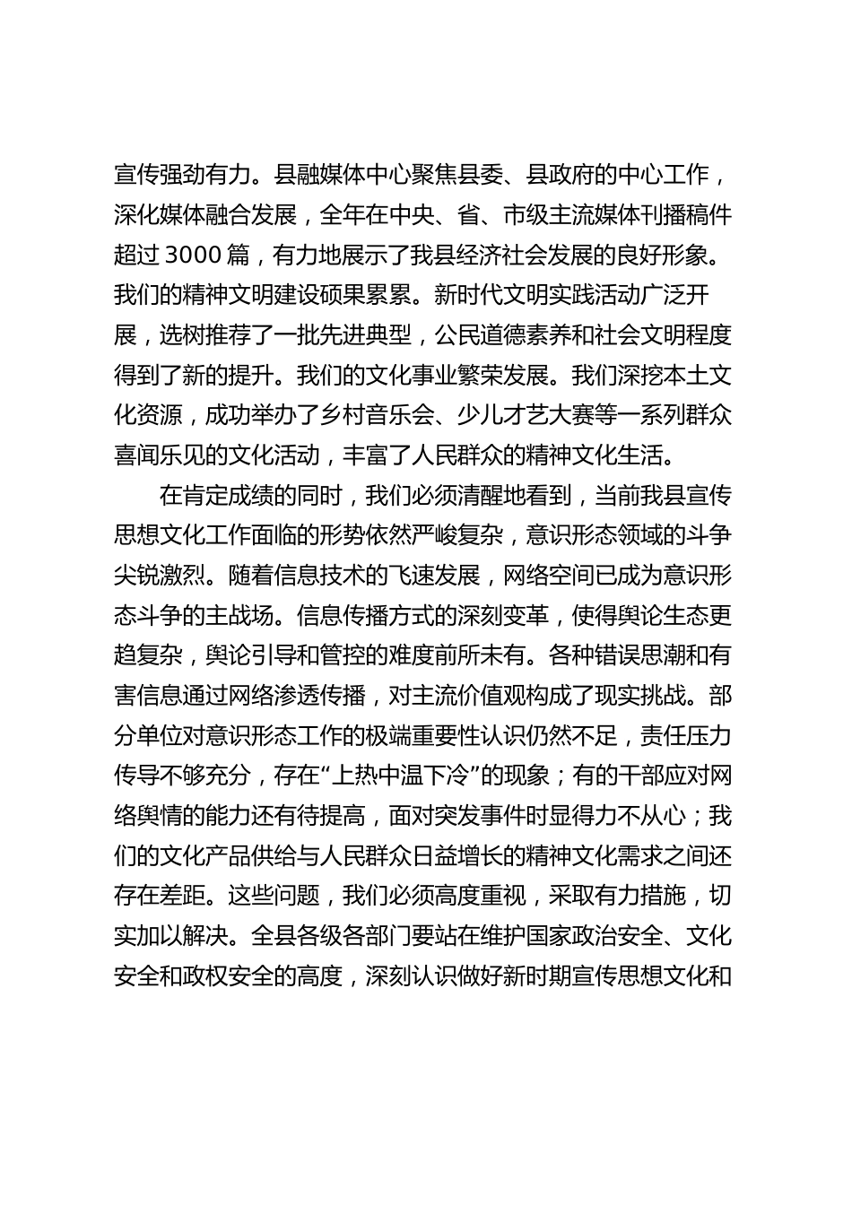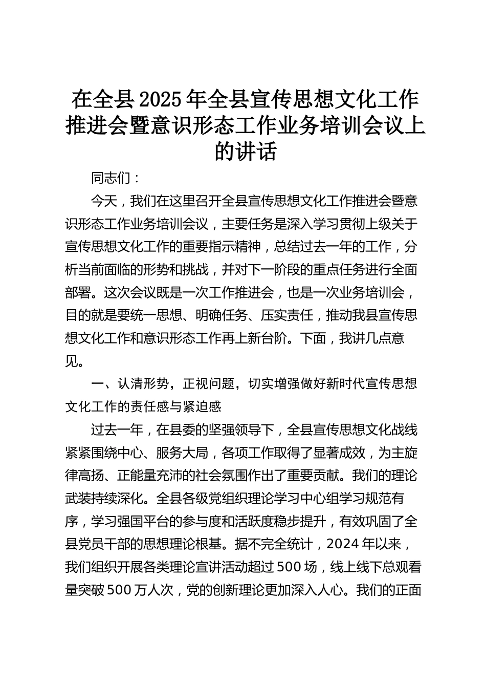 在全縣2025年全縣宣傳思想文化工作推進(jìn)會(huì)暨意識(shí)形態(tài)工作業(yè)務(wù)培訓(xùn)會(huì)議上的講話同志們:今天,我們?cè)谶@里召開(kāi)全縣宣傳思想文化工作推進(jìn)會(huì)暨意識(shí)形態(tài)工作業(yè)務(wù)培訓(xùn)會(huì)議,主要任務(wù)是深入學(xué)習(xí)貫徹上級(jí)關(guān)于宣傳思想文化工作的重要指示精神,總結(jié)過(guò)去一年的工作,分析當(dāng)前面臨的形勢(shì)和挑戰(zhàn),并對(duì)下一階段的重點(diǎn)任務(wù)進(jìn)行全面部署。這次會(huì)議既是一次工作推進(jìn)會(huì),也是一次業(yè)務(wù)培訓(xùn)會(huì),目的就是要統(tǒng)一思想、明確任務(wù)、壓實(shí)責(zé)任,推動(dòng)我縣宣傳思想文化工作和意識(shí)形態(tài)工作再上新臺(tái)階。下面,我講幾點(diǎn)意見(jiàn)。一、認(rèn)清形勢(shì),正視問(wèn)題,切實(shí)增強(qiáng)做好新時(shí)代宣傳思想文化工作的責(zé)任感與緊迫感...