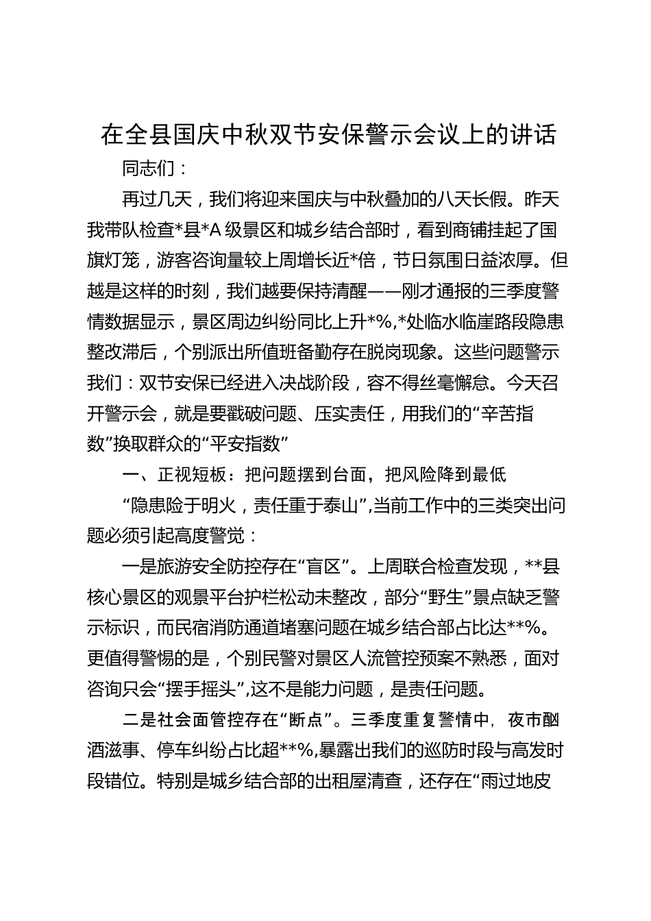 在全縣國慶中秋雙節(jié)安保警示會議上的講話同志們:再過幾天,我們將迎來國慶與中秋疊加的八天長假。昨天我?guī)ш?duì)檢查*縣*A級景區(qū)和城鄉(xiāng)結(jié)合部時,看到商鋪掛起了國旗燈籠,游客咨詢量較上周增長近*倍,節(jié)日氛圍日益濃厚。但越是這樣的時刻,我們越要保持清醒——剛才通報(bào)的三季度警情數(shù)據(jù)顯示,景區(qū)周邊糾紛同比上升*%,*處臨水臨崖路段隱患整改滯后,個別派出所值班備勤存在脫崗現(xiàn)象。這些問題警示我們:雙節(jié)安保已經(jīng)進(jìn)入決戰(zhàn)階段,容不得絲毫懈怠。今天召“開警示會,就是要戳破問題、壓實(shí)責(zé)任,用我們的辛苦指”“”數(shù)換取群眾的平安指數(shù)一、正視短板:把問題擺到臺面,把...