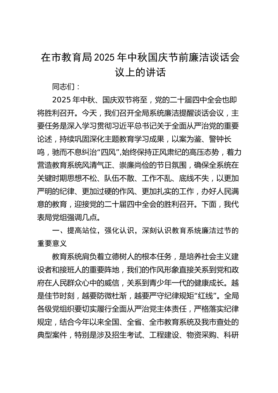 在市教育局2025年中秋國慶節(jié)前廉潔談話會議上的講話