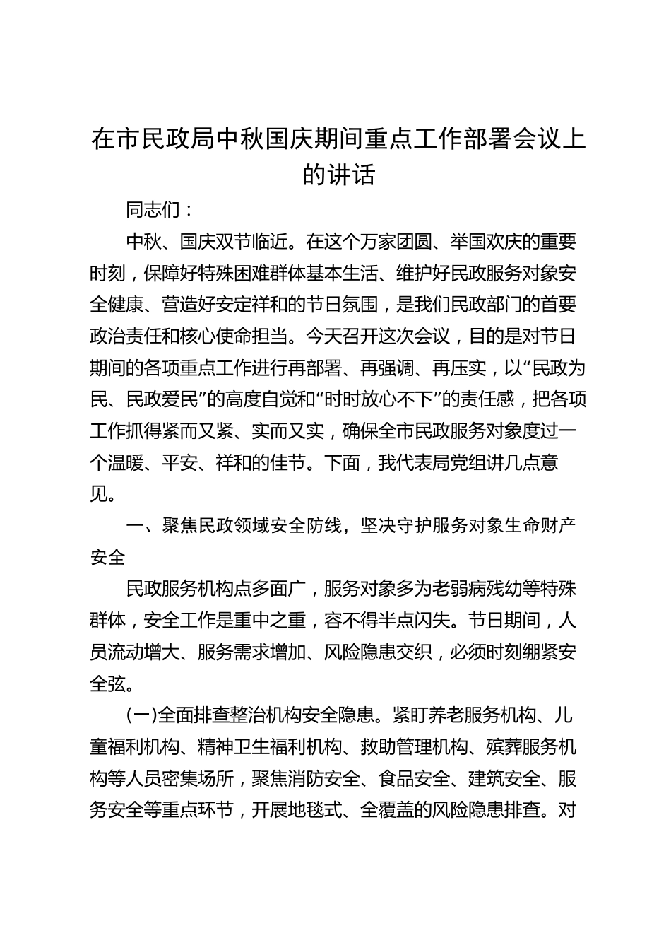 在市民政局中秋國慶期間重點工作部署會議上的講話同志們:中秋、國慶雙節(jié)臨近。在這個萬家團圓、舉國歡慶的重要時刻,保障好特殊困難群體基本生活、維護好民政服務對象安全健康、營造好安定祥和的節(jié)日氛圍,是我們民政部門的首要政治責任和核心使命擔當。今天召開這次會議,目的是對節(jié)日“期間的各項重點工作進行再部署、再強調(diào)、再壓實,以民政為”“”民、民政愛民的高度自覺和時時放心不下的責任感,把各項工作抓得緊而又緊、實而又實,確保全市民政服務對象度過一個溫暖、平安、祥和的佳節(jié)。下面,我代表局黨組講幾點意見。一、聚焦民政領域安全防線,堅決守護服務對...