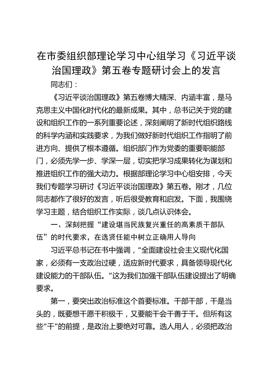 在市委組織部理論學(xué)習(xí)中心組學(xué)習(xí)《習(xí)近平談治國理政》第五卷專題研討會上的發(fā)言