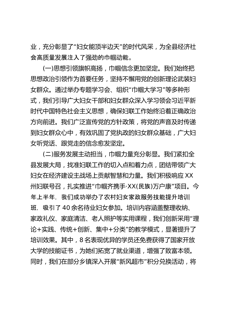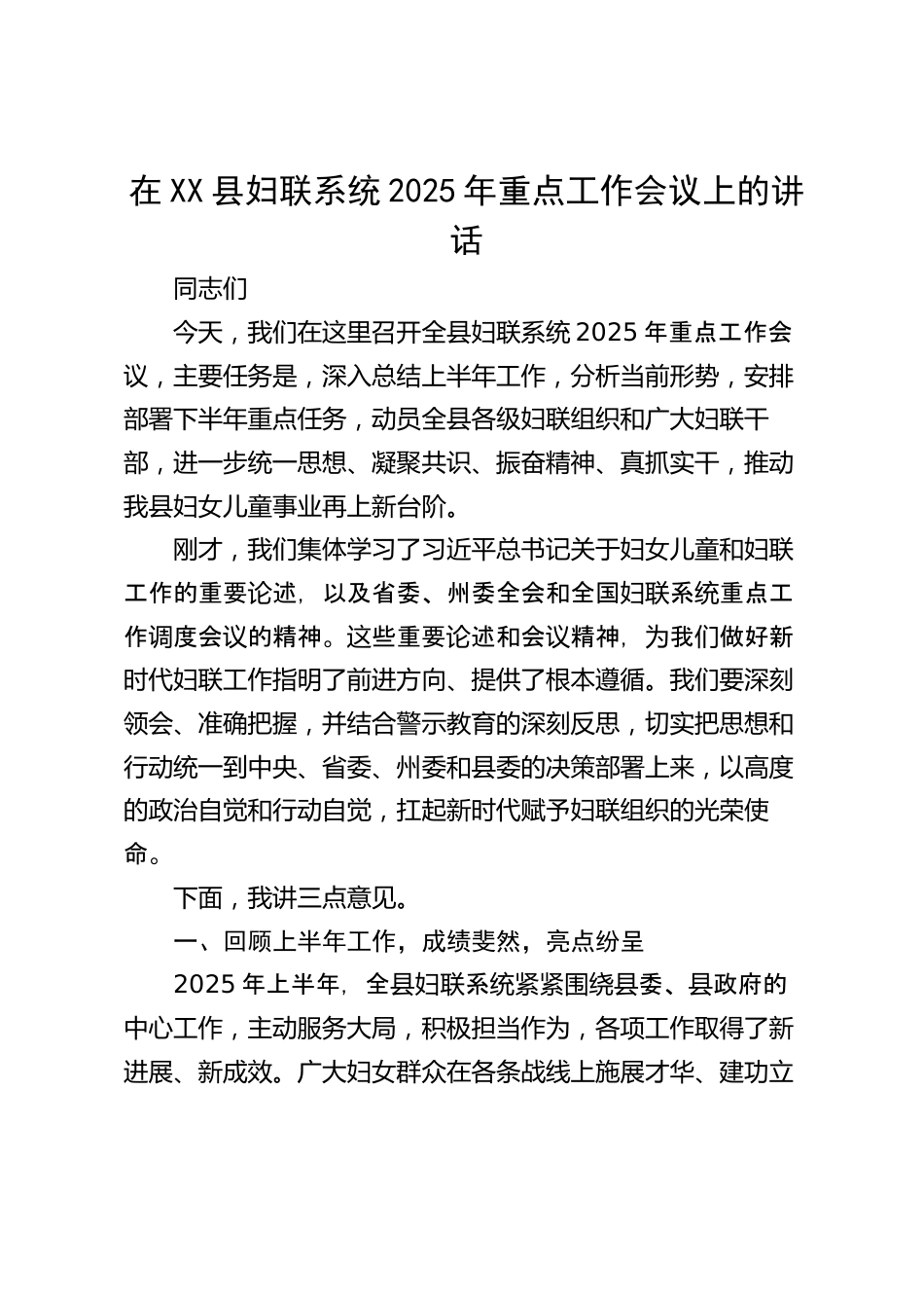 在XX縣婦聯(lián)系統(tǒng)2025年重點工作會議上的講話同志們今天,我們在這里召開全縣婦聯(lián)系統(tǒng)2025年重點工作會議,主要任務(wù)是,深入總結(jié)上半年工作,分析當(dāng)前形勢,安排部署下半年重點任務(wù),動員全縣各級婦聯(lián)組織和廣大婦聯(lián)干部,進一步統(tǒng)一思想、凝聚共識、振奮精神、真抓實干,推動我縣婦女兒童事業(yè)再上新臺階。剛才,我們集體學(xué)習(xí)了習(xí)近平總書記關(guān)于婦女兒童和婦聯(lián)工作的重要述,以及省委、州委全會和全國系重點工論婦聯(lián)統(tǒng)作度會的精神。些重要述和會精神,我做好新調(diào)議這論議為們時代婦聯(lián)工作指明了前進方向、提供了根本遵循。我們要深刻領(lǐng)會、準確把握,并結(jié)合警示教育的深刻...