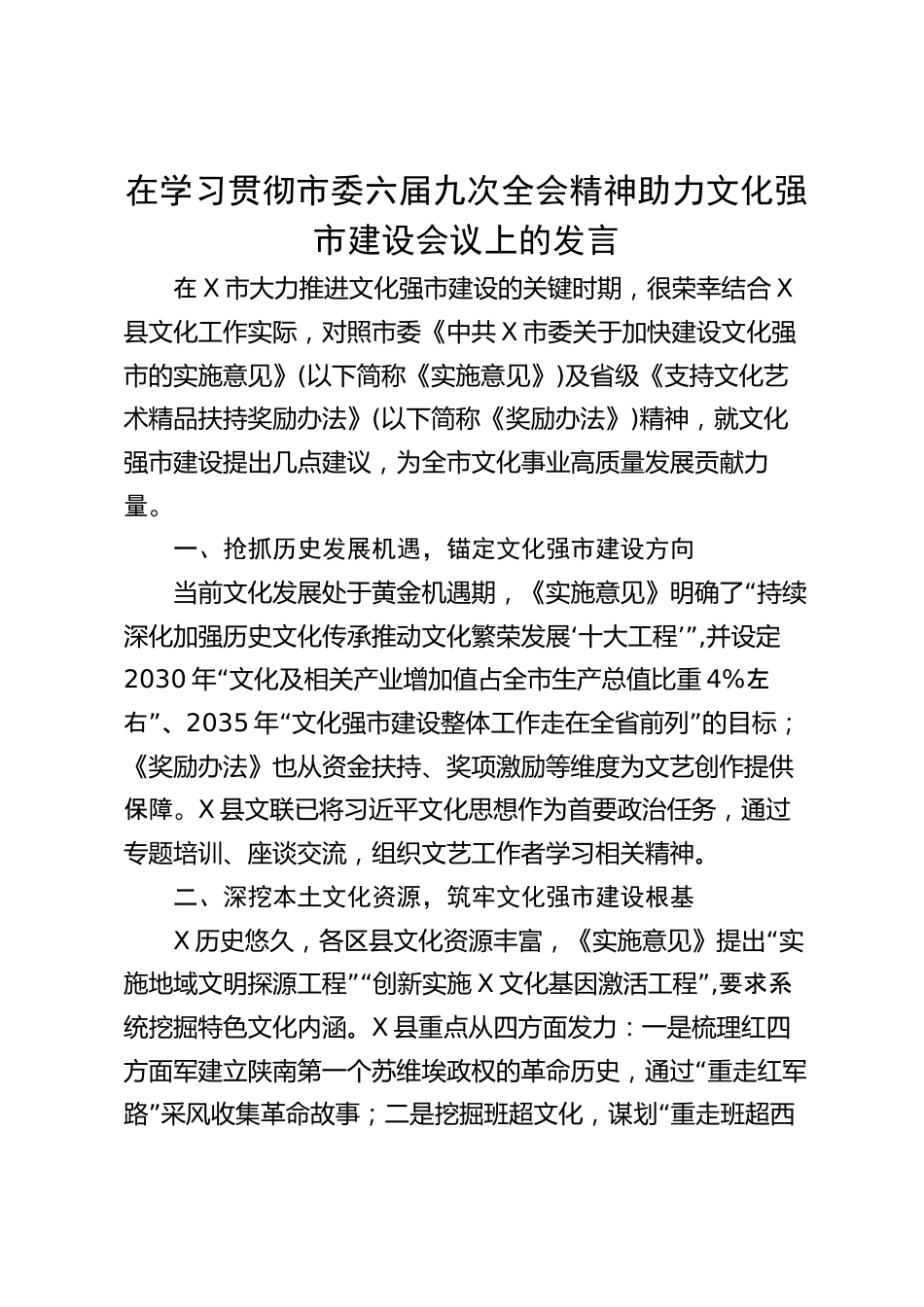 在學(xué)習(xí)貫徹市委六屆九次全會精神助力文化強(qiáng)市建設(shè)會議上的發(fā)言