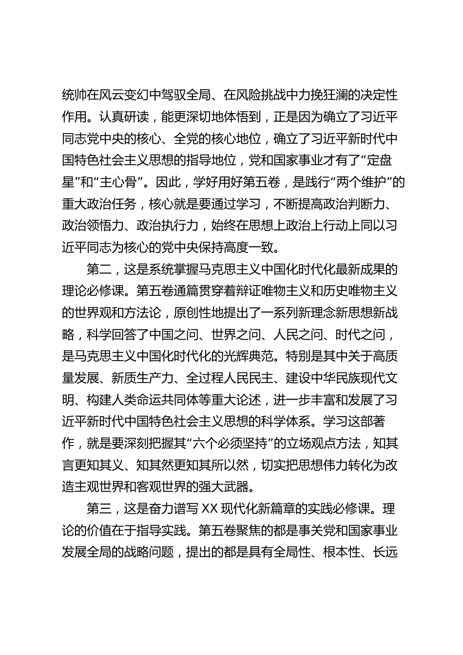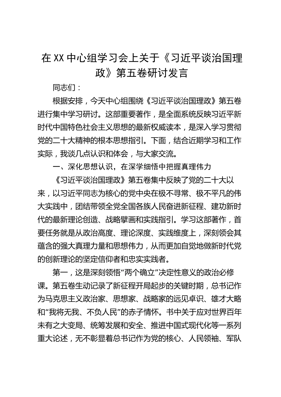 在XX中心組學(xué)習(xí)會(huì)上關(guān)于《習(xí)近平談治國(guó)理政》第五卷研討發(fā)言同志們:根據(jù)安排,今天中心組圍繞《習(xí)近平談治國(guó)理政》第五卷進(jìn)行集中學(xué)習(xí)研討。這部重要著作,是全面系統(tǒng)反映習(xí)近平新時(shí)代中國(guó)特色社會(huì)主義思想的最新權(quán)威讀本,是深入學(xué)習(xí)貫徹黨的二十大精神的根本思想指引。下面,結(jié)合近期學(xué)習(xí)和工作實(shí)際,我談幾點(diǎn)認(rèn)識(shí)和體會(huì),與大家交流。一、深化思想認(rèn)識(shí),在深學(xué)細(xì)悟中把握真理偉力《習(xí)近平談治國(guó)理政》第五卷集中反映了黨的二十大以來(lái),以習(xí)近平同志為核心的黨中央在極不尋常、極不平凡的偉大實(shí)踐中,團(tuán)結(jié)帶領(lǐng)全黨全國(guó)各族人民奮進(jìn)新征程、建功新時(shí)代的最新理論創(chuàng)造、...