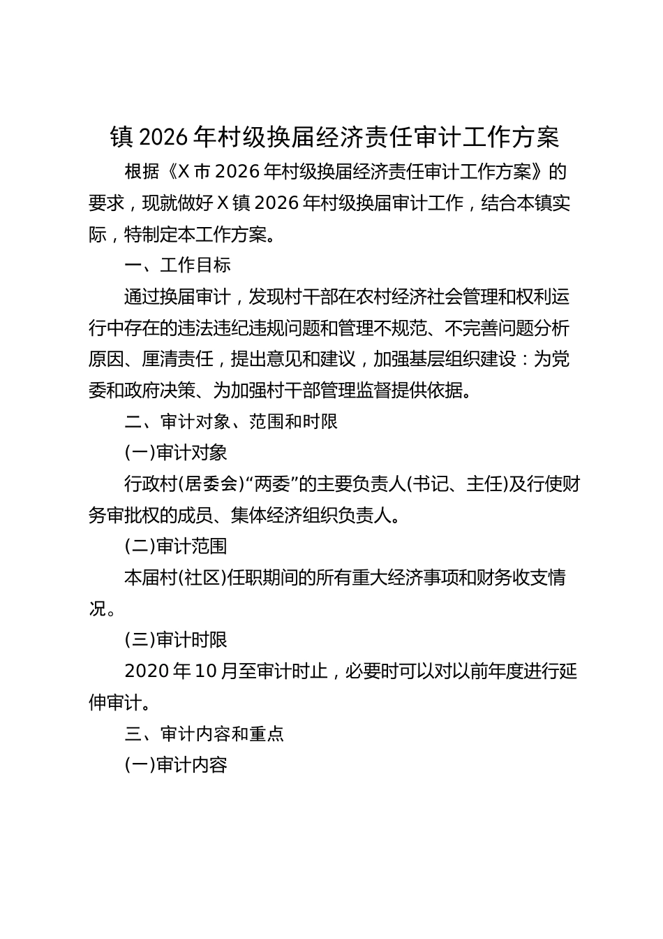 鎮(zhèn)2026年村級(jí)換屆經(jīng)濟(jì)責(zé)任審計(jì)工作方案根據(jù)《X市2026年村級(jí)換屆經(jīng)濟(jì)責(zé)任審計(jì)工作方案》的要求,現(xiàn)就做好X鎮(zhèn)2026年村級(jí)換屆審計(jì)工作,結(jié)合本鎮(zhèn)實(shí)際,特制定本工作方案。一、工作目標(biāo)通過換屆審計(jì),發(fā)現(xiàn)村干部在農(nóng)村經(jīng)濟(jì)社會(huì)管理和權(quán)利運(yùn)行中存在的違法違紀(jì)違規(guī)問題和管理不規(guī)范、不完善問題分析原因、厘清責(zé)任,提出意見和建議,加強(qiáng)基層組織建設(shè):為黨委和政府決策、為加強(qiáng)村干部管理監(jiān)督提供依據(jù)。二、審計(jì)對(duì)象、范圍和時(shí)限(一)審計(jì)對(duì)象行政村(居委會(huì))“”兩委的主要負(fù)責(zé)人(書記、主任)及行使財(cái)務(wù)審批權(quán)的成員、集體經(jīng)濟(jì)組織負(fù)責(zé)人。(二)審計(jì)范圍本屆村(社區(qū))任職期間的...