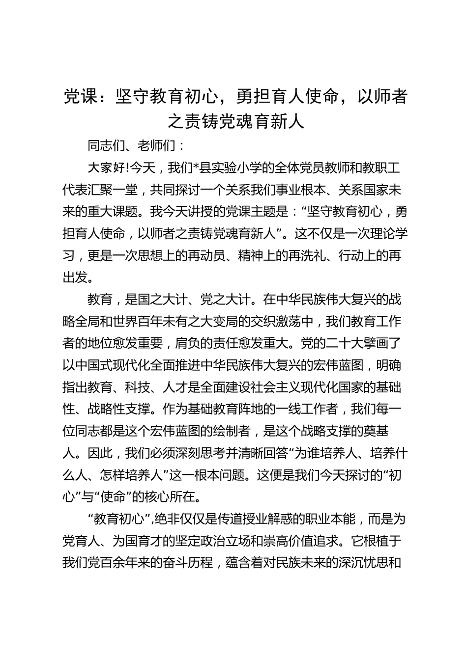 黨課:堅(jiān)守教育初心,勇?lián)耸姑詭熣咧?zé)鑄黨魂育新人同志們、老師們:大家好!今天,我們*縣實(shí)驗(yàn)小學(xué)的全體黨員教師和教職工代表匯聚一堂,共同探討一個(gè)關(guān)系我們事業(yè)根本、關(guān)系國家未“來的重大課題。我今天講授的黨課主題是:堅(jiān)守教育初心,勇”擔(dān)育人使命,以師者之責(zé)鑄黨魂育新人。這不僅是一次理論學(xué)習(xí),更是一次思想上的再動員、精神上的再洗禮、行動上的再出發(fā)。教育,是國之大計(jì)、黨之大計(jì)。在中華民族偉大復(fù)興的戰(zhàn)略全局和世界百年未有之大變局的交織激蕩中,我們教育工作者的地位愈發(fā)重要,肩負(fù)的責(zé)任愈發(fā)重大。黨的二十大擘畫了以中國式現(xiàn)代化全面推進(jìn)中...