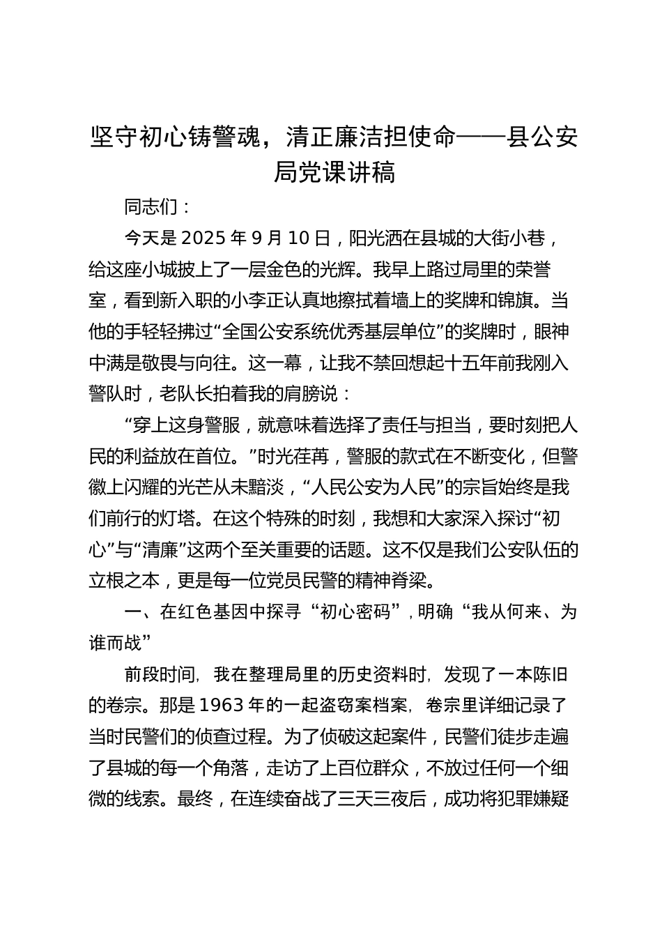 堅(jiān)守初心鑄警魂,清正廉潔擔(dān)使命——縣公安局黨課講稿