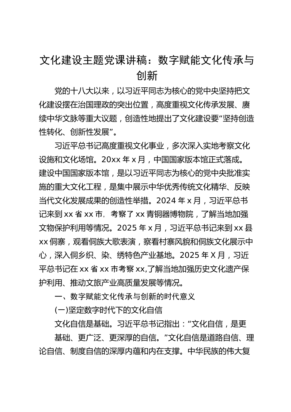 文化建設(shè)主題黨課講稿:數(shù)字賦能文化傳承與創(chuàng)新黨的十八大以來,以習(xí)近平同志為核心的黨中央堅(jiān)持把文化建設(shè)擺在治國理政的突出位置,高度重視文化傳承發(fā)展、賡“續(xù)中華文脈等重大議題,創(chuàng)造性地提出了文化建設(shè)要堅(jiān)持創(chuàng)造”性轉(zhuǎn)化、創(chuàng)新性發(fā)展。習(xí)近平總書記高度重視文化事業(yè),多次深入實(shí)地考察文化設(shè)施和文化場館。20xx年x月,中國國家版本館正式落成。建設(shè)中國國家版本館,是以習(xí)近平同志為核心的黨中央批準(zhǔn)實(shí)施的重大文化工程,是集中展示中華優(yōu)秀傳統(tǒng)文化精華、反映當(dāng)代文化發(fā)展成果的創(chuàng)造性舉措。2024年x月,習(xí)近平總書記來到xx省xx市,考察了xx青銅器博物院,了解當(dāng)...