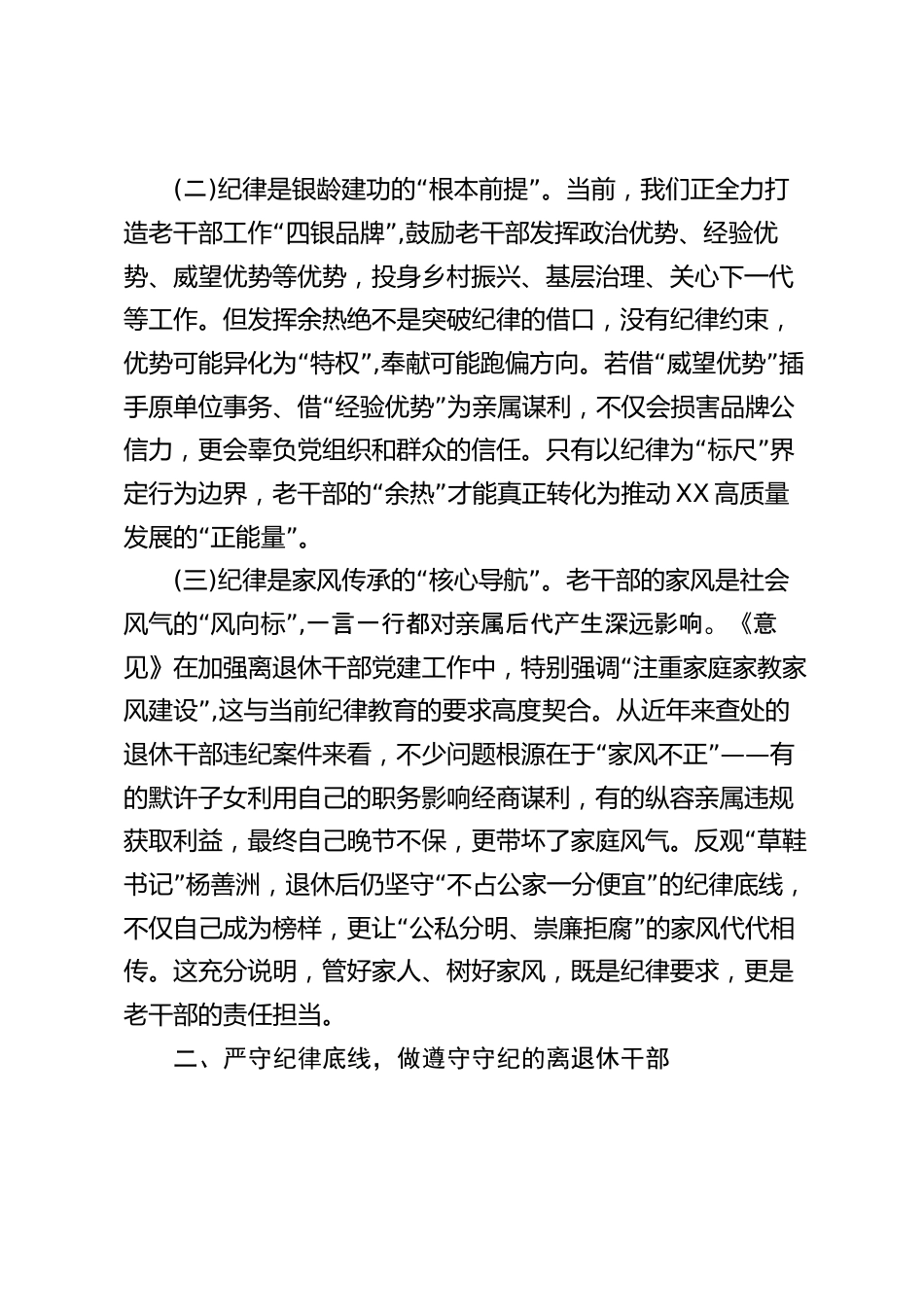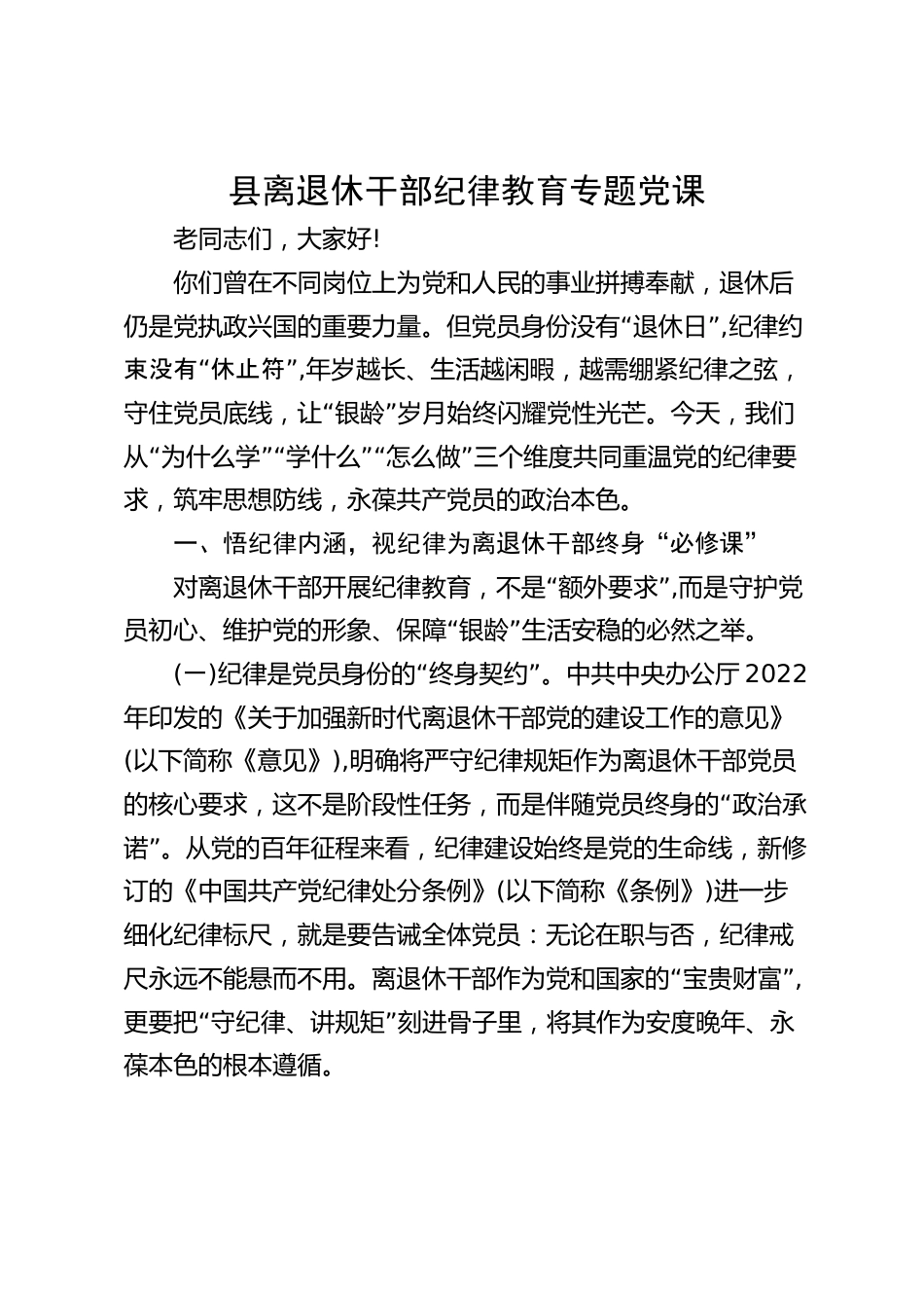縣離退休干部紀(jì)律教育專題黨課老同志們,大家好!你們曾在不同崗位上為黨和人民的事業(yè)拼搏奉獻(xiàn),退休后“”仍是黨執(zhí)政興國的重要力量。但黨員身份沒有退休日,紀(jì)律約“”束沒有休止符,年歲越長、生活越閑暇,越需繃緊紀(jì)律之弦,“”守住黨員底線,讓銀齡歲月始終閃耀黨性光芒。今天,我們“”“”“”從為什么學(xué)學(xué)什么怎么做三個維度共同重溫黨的紀(jì)律要求,筑牢思想防線,永葆共產(chǎn)黨員的政治本色。一、悟紀(jì)律內(nèi)涵,視紀(jì)律為離退休干部終身“必修課”“”對離退休干部開展紀(jì)律教育,不是額外要求,而是守護(hù)黨“”員初心、維護(hù)黨的形象、保障銀齡生活安穩(wěn)的必然之舉。(一)“”...