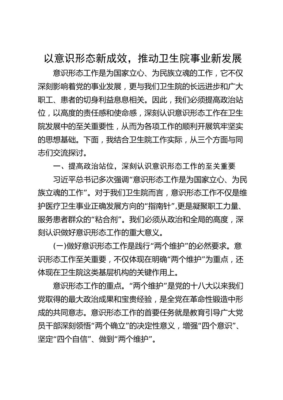 以意識形態(tài)新成效,推動衛(wèi)生院事業(yè)新發(fā)展意識形態(tài)工作是為國家立心、為民族立魂的工作,它不僅深刻影響著黨的事業(yè)發(fā)展,更與我們衛(wèi)生院的長遠進步和廣大職工、患者的切身利益息息相關。因此,我們必須提高政治站位,以高度的責任感和使命感,深刻認識意識形態(tài)工作在衛(wèi)生院發(fā)展中的至關重要性,從而為各項工作的順利開展筑牢堅實的思想基礎。下面,我結合衛(wèi)生院工作實際,從三個方面與同志們交流探討。一、提高政治站位,深刻認識意識形態(tài)工作的至關重要“習近平總書記多次強調(diào)意識形態(tài)工作是為國家立心、為民”族立魂的工作。對于我們衛(wèi)生院而言,意識形態(tài)工作不僅是維“...