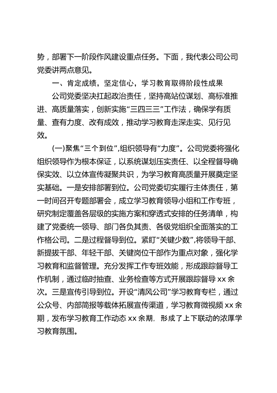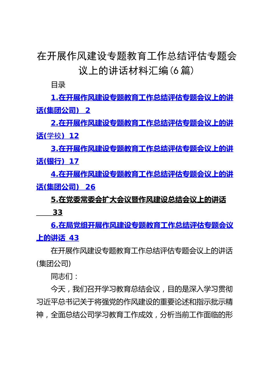 在開展作風(fēng)建設(shè)專題教育工作總結(jié)評估專題會議上的講話材料匯編(6篇)目錄1.在開展作風(fēng)建設(shè)專題教育工作總結(jié)評估專題會議上的講話(集團公司)22.在開展作風(fēng)建設(shè)專題教育工作總結(jié)評估專題會議上的講話(學(xué)校)123.在開展作風(fēng)建設(shè)專題教育工作總結(jié)評估專題會議上的講話(銀行)174.在開展作風(fēng)建設(shè)專題教育工作總結(jié)評估專題會議上的講話(集團公司)265.在黨委常委會擴大會議暨作風(fēng)建設(shè)總結(jié)會議上的講話336.在局黨組開展作風(fēng)建設(shè)專題教育工作總結(jié)評估專題會議上的講話43在開展作風(fēng)建設(shè)專題教育工作總結(jié)評估專題會議上的講話(集團公司)同志們:今天,我們召開學(xué)習(xí)教育總結(jié)會議,目的是...