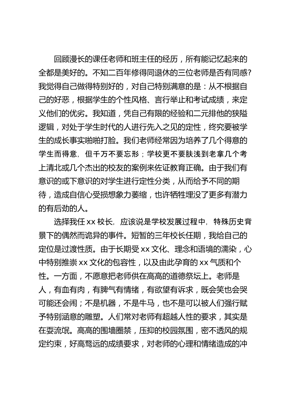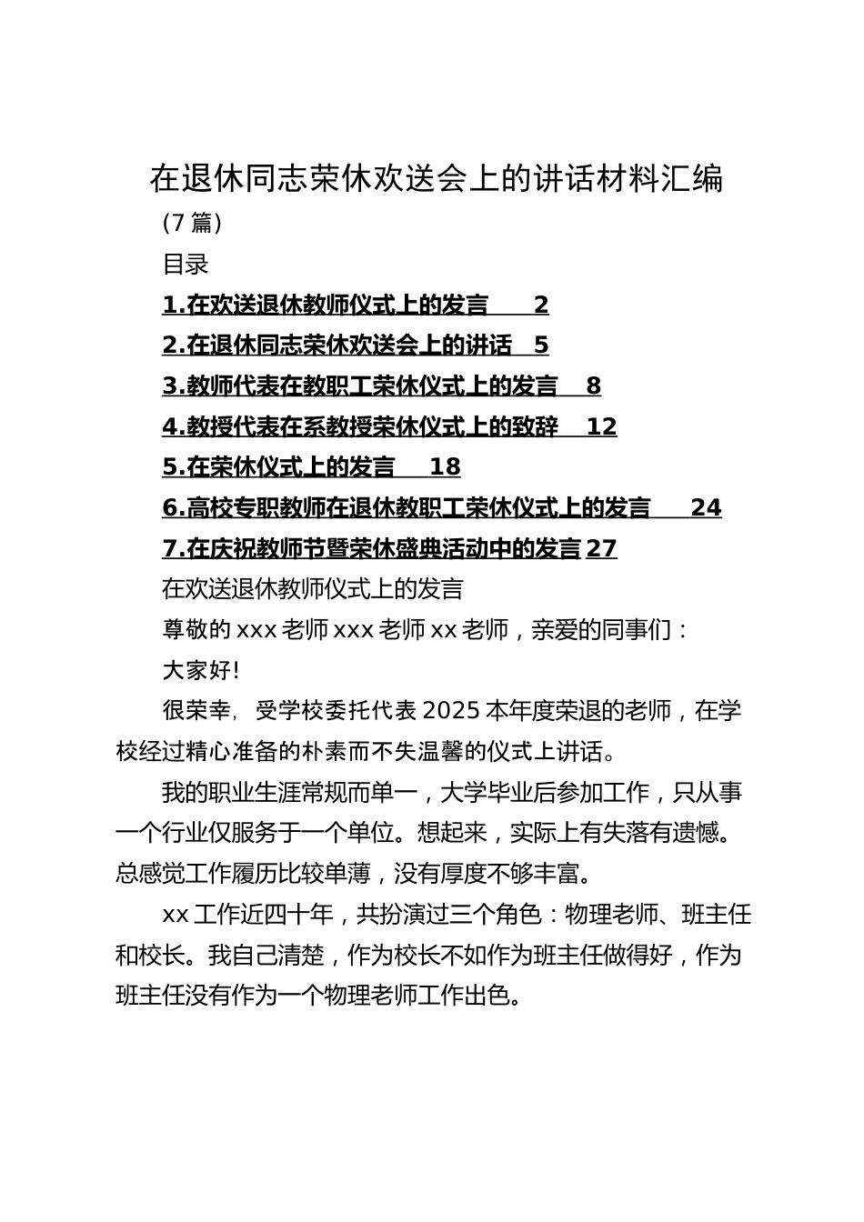 在退休同志榮休歡送會(huì)上的講話材料匯編(7篇)目錄1.在歡送退休教師儀式上的發(fā)言22.在退休同志榮休歡送會(huì)上的講話53.教師代表在教職工榮休儀式上的發(fā)言84.教授代表在系教授榮休儀式上的致辭125.在榮休儀式上的發(fā)言186.高校專職教師在退休教職工榮休儀式上的發(fā)言247.在慶祝教師節(jié)暨榮休盛典活動(dòng)中的發(fā)言27在歡送退休教師儀式上的發(fā)言尊敬的xxx老師xxx老師xx老師,親愛的同事們:大家好!很榮幸,受學(xué)校委托代表2025本年度榮退的老師,在學(xué)校精心準(zhǔn)的樸素而不失溫馨的式上。經(jīng)過備儀講話我的職業(yè)生涯常規(guī)而單一,大學(xué)畢業(yè)后參加工作,只從事一個(gè)行業(yè)僅服務(wù)于一個(gè)單位。想起來...