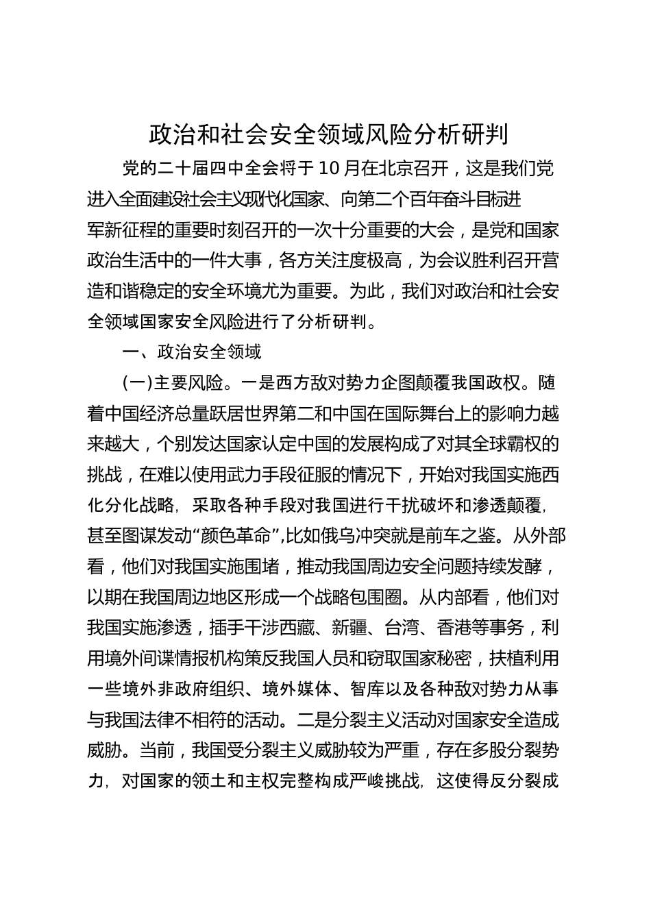政治和社會安全領域風險分析研判黨的二十屆四中全會將于10月在北京召開,這是我們黨進入全面建設社會主義現(xiàn)代化國家、向第二個百年奮斗目標進軍新征程的重要時刻召開的一次十分重要的大會,是黨和國家政治生活中的一件大事,各方關注度極高,為會議勝利召開營造和諧穩(wěn)定的安全環(huán)境尤為重要。為此,我們對政治和社會安全域國家安全行了分析研判。領風險進一、政治安全領域(一)主要風險。一是西方力企覆我國政。隨敵對勢圖顛權著中國經濟總量躍居世界第二和中國在國際舞臺上的影響力越來越大,個別發(fā)達國家認定中國的發(fā)展構成了對其全球霸權的挑戰(zhàn),在難以使用武力手段征服...