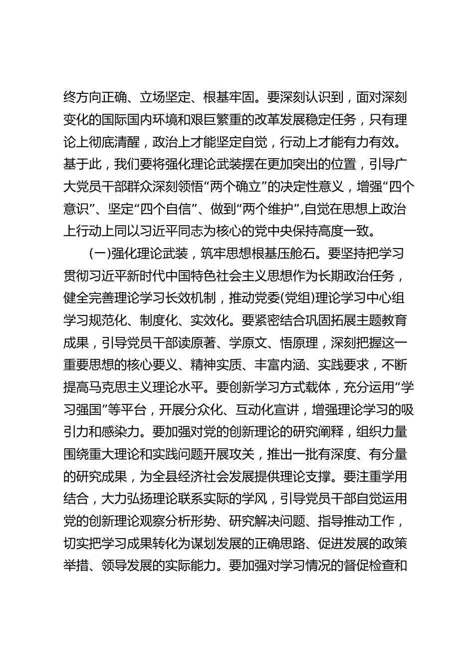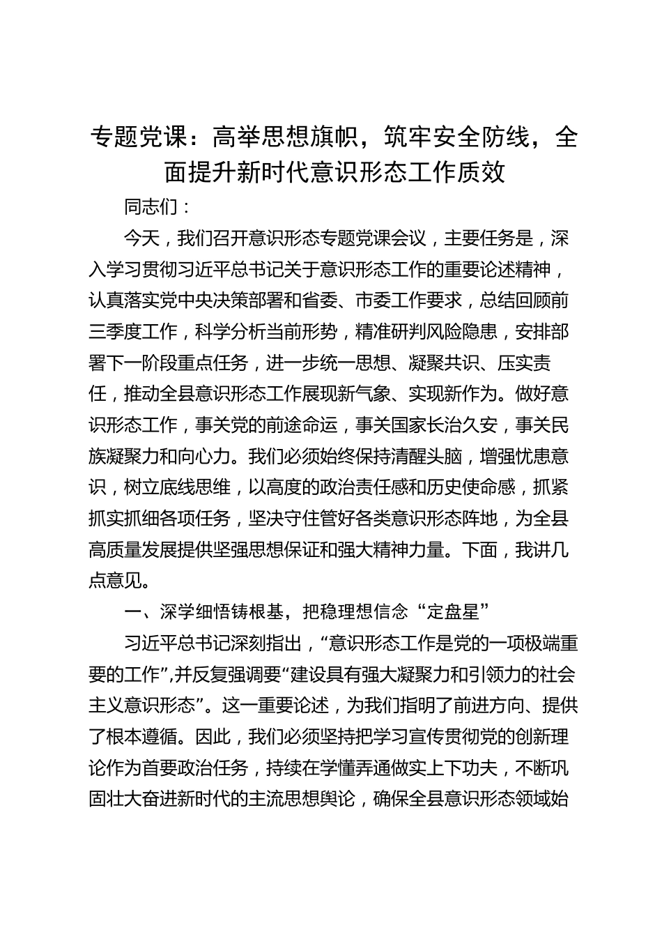 專題黨課:高舉思想旗幟,筑牢安全防線,全面提升新時代意識形態(tài)工作質(zhì)效同志們:今天,我們召開意識形態(tài)專題黨課會議,主要任務(wù)是,深入學(xué)習(xí)貫徹習(xí)近平總書記關(guān)于意識形態(tài)工作的重要論述精神,認(rèn)真落實黨中央決策部署和省委、市委工作要求,總結(jié)回顧前三季度工作,科學(xué)分析當(dāng)前形勢,精準(zhǔn)研判風(fēng)險隱患,安排部署下一階段重點任務(wù),進(jìn)一步統(tǒng)一思想、凝聚共識、壓實責(zé)任,推動全縣意識形態(tài)工作展現(xiàn)新氣象、實現(xiàn)新作為。做好意識形態(tài)工作,事關(guān)黨的前途命運(yùn),事關(guān)國家長治久安,事關(guān)民族凝聚力和向心力。我們必須始終保持清醒頭腦,增強(qiáng)憂患意識,樹立底線思維,以高度的政...