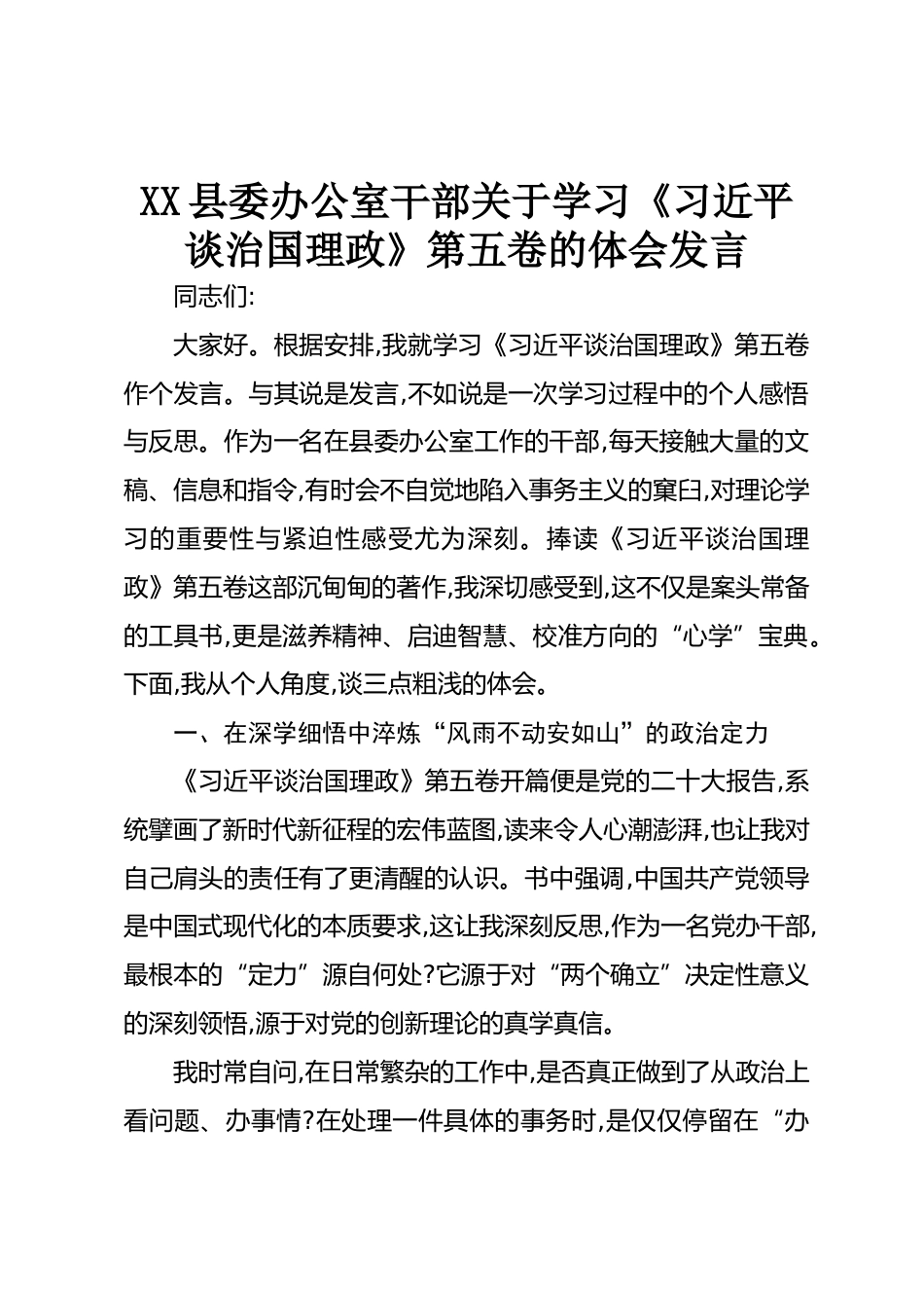 XX縣委辦公室干部關(guān)于學(xué)習(xí)《習(xí)近平談治國(guó)理政》第五卷的體會(huì)發(fā)言
