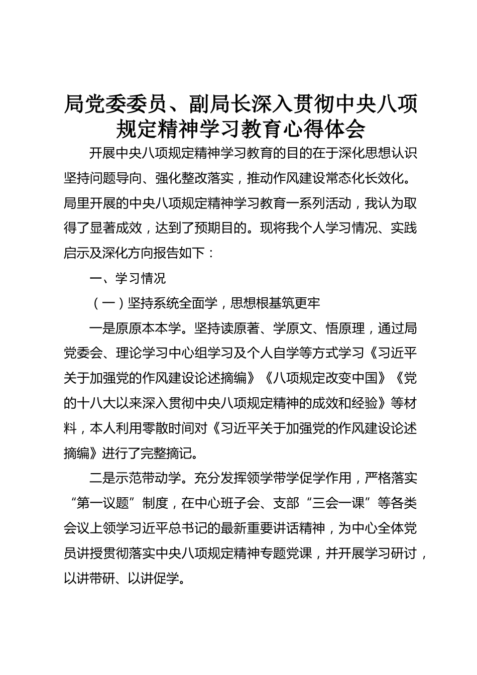 局黨委委員、副局長深入貫徹中央八項規(guī)定精神學(xué)習(xí)教育心得體會開展中央八項規(guī)定精神學(xué)習(xí)教育的目的在于深化思想認識堅持問題導(dǎo)向、強化整改落實,推動作風(fēng)建設(shè)常態(tài)化長效化。局里開展的中央八項規(guī)定精神學(xué)習(xí)教育一系列活動,我認為取得了顯著成效,達到了預(yù)期目的?,F(xiàn)將我個人學(xué)習(xí)情況、實踐啟示及深化方向報告如下:一、學(xué)習(xí)情況(一)堅持系統(tǒng)全面學(xué),思想根基筑更牢一是原原本本學(xué)。堅持讀原著、學(xué)原文、悟原理,通過局黨委會、理論學(xué)習(xí)中心組學(xué)習(xí)及個人自學(xué)等方式學(xué)習(xí)《習(xí)近平關(guān)于加強黨的作風(fēng)建設(shè)論述摘編》《八項規(guī)定改變中國》《黨的十八大以來深入貫徹中央八項規(guī)...