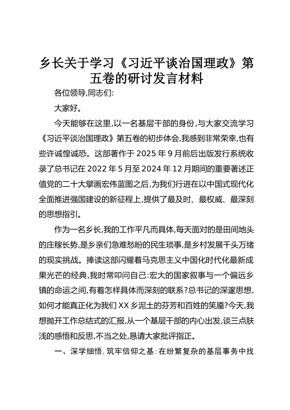 鄉(xiāng)長關于學習《習近平談治國理政》第五卷的研討發(fā)言材料各位領導,同志們:大家好。今天能夠在這里,以一名基層干部的身份,與大家交流學習《習近平談治國理政》第五卷的初步體會,我感到非常榮幸,也有些許誠惶誠恐。這部著作于2025年9月前后出版發(fā)行系統(tǒng)收錄了總書記在2022年5月至2024年12月期間的重要著述正值黨的二十大擘畫宏偉藍圖之后,為我們行進在以中國式現(xiàn)代化全面推進強國建設的新征程上,提供了最及時、最權威、最深刻的思想指引。作為一名鄉(xiāng)長,我的工作平凡而具體,每天面對的是田間地頭的莊稼長勢,是鄉(xiāng)親們急難愁盼的民生瑣事,是鄉(xiāng)村發(fā)展千頭萬緒的現(xiàn)實挑戰(zhàn)。捧讀這...