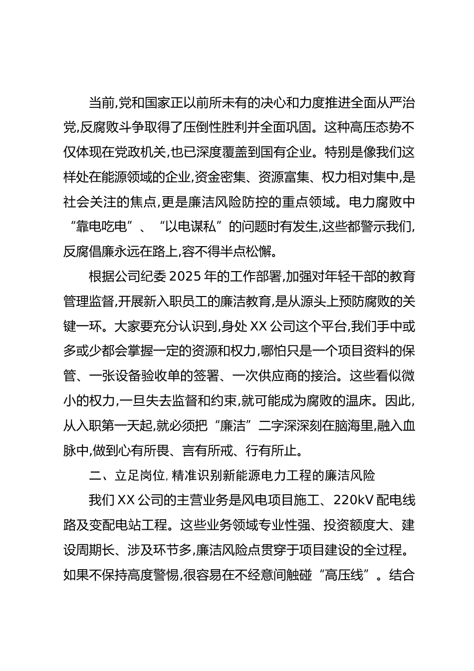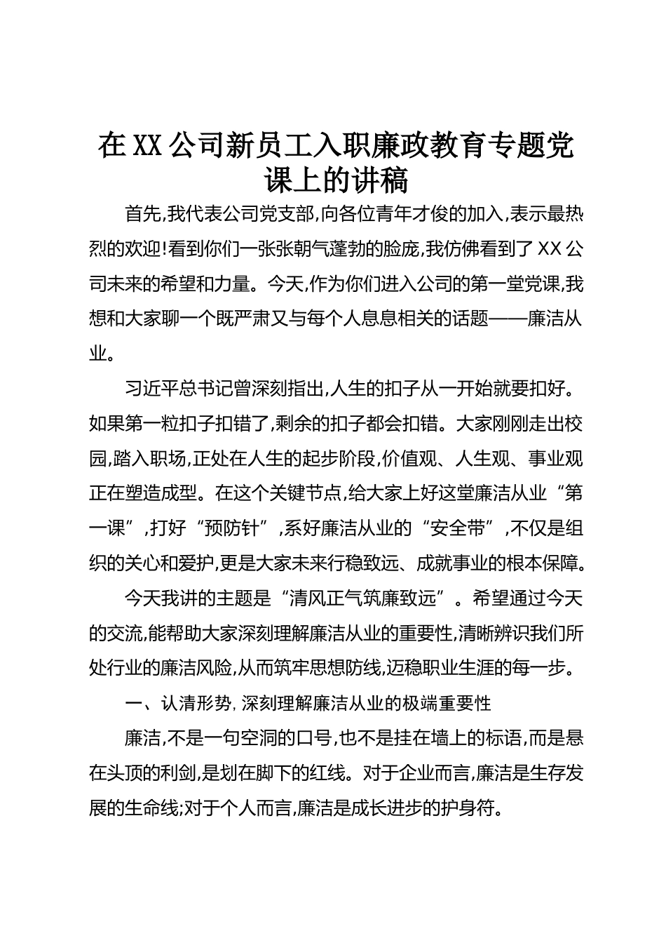 在XX公司新員工入職廉政教育專題黨課上的講稿首先,我代表公司黨支部,向各位青年才俊的加入,表示最熱烈的歡迎!看到你們一張張朝氣蓬勃的臉龐,我仿佛看到了XX公司未來的希望和力量。今天,作為你們進入公司的第一堂黨課,我想和大家聊一個既嚴肅又與每個人息息相關的話題——廉潔從業(yè)。習近平總書記曾深刻指出,人生的扣子從一開始就要扣好。如果第一??圩涌坼e了,剩余的扣子都會扣錯。大家剛剛走出校園,踏入職場,正處在人生的起步階段,價值觀、人生觀、事業(yè)觀正在塑造成型。在這個關鍵節(jié)點,給大家上好這堂廉潔從業(yè)“第一課”,打好“預防針”,系好廉潔從業(yè)的“安全帶”,不僅是...
