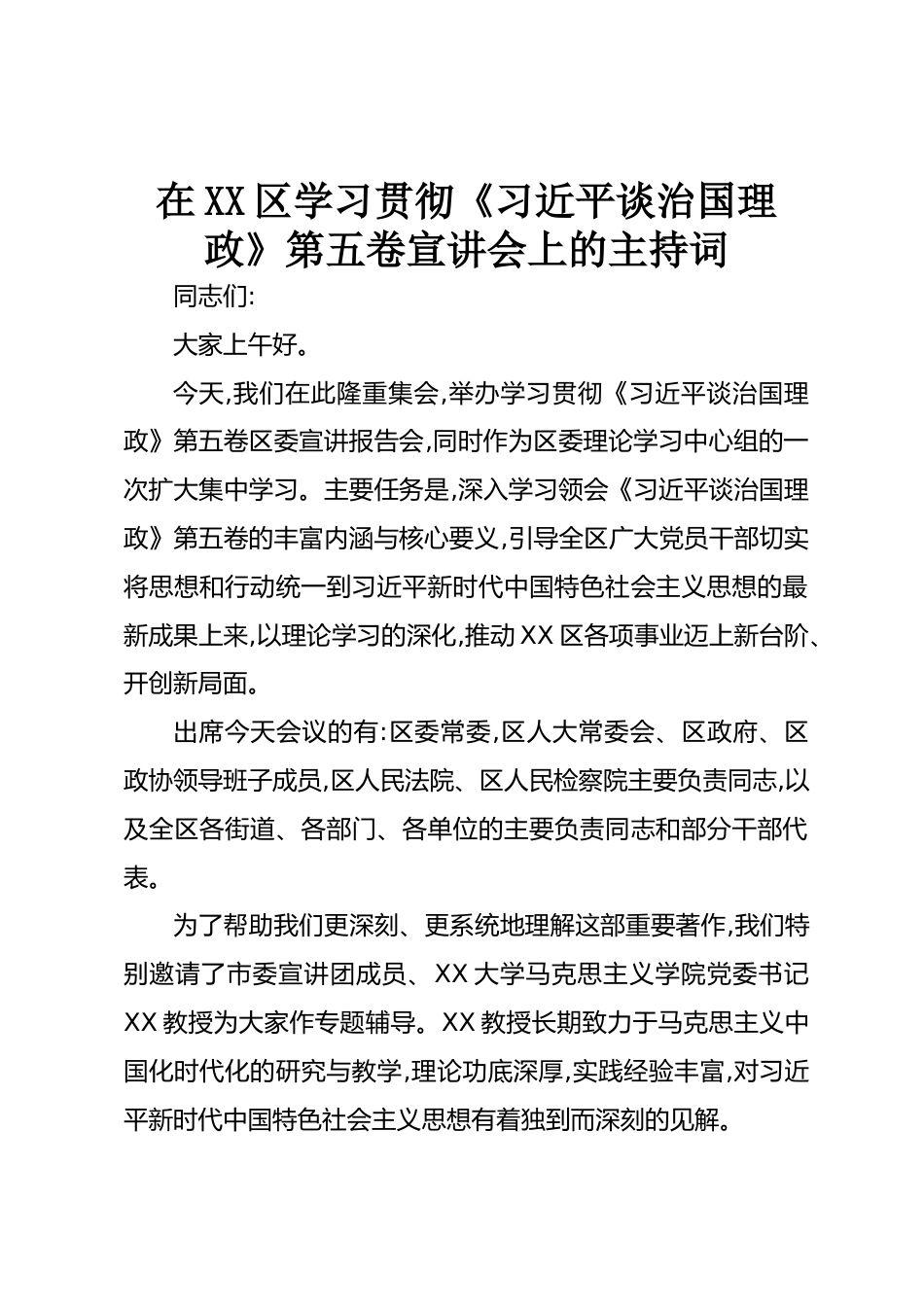 在XX區(qū)學(xué)習(xí)貫徹《習(xí)近平談治國(guó)理政》第五卷宣講會(huì)上的主持詞