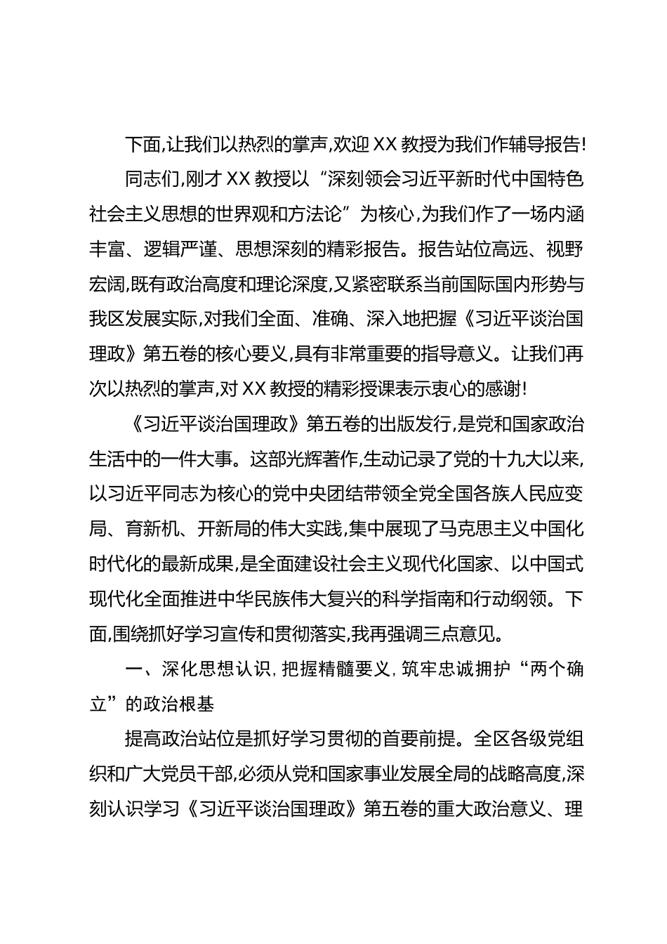 在XX區(qū)學(xué)習(xí)貫徹《習(xí)近平談治國(guó)理政》第五卷宣講會(huì)上的主持詞同志們:大家上午好。今天,我們?cè)诖寺≈丶瘯?huì),舉辦學(xué)習(xí)貫徹《習(xí)近平談治國(guó)理政》第五卷區(qū)委宣講報(bào)告會(huì),同時(shí)作為區(qū)委理論學(xué)習(xí)中心組的一次擴(kuò)大集中學(xué)習(xí)。主要任務(wù)是,深入學(xué)習(xí)領(lǐng)會(huì)《習(xí)近平談治國(guó)理政》第五卷的豐富內(nèi)涵與核心要義,引導(dǎo)全區(qū)廣大黨員干部切實(shí)將思想和行動(dòng)統(tǒng)一到習(xí)近平新時(shí)代中國(guó)特色社會(huì)主義思想的最新成果上來,以理論學(xué)習(xí)的深化,推動(dòng)XX區(qū)各項(xiàng)事業(yè)邁上新臺(tái)階、開創(chuàng)新局面。出席今天會(huì)議的有:區(qū)委常委,區(qū)人大常委會(huì)、區(qū)政府、區(qū)政協(xié)領(lǐng)導(dǎo)班子成員,區(qū)人民法院、區(qū)人民檢察院主要負(fù)責(zé)同志,以及全區(qū)各街道...