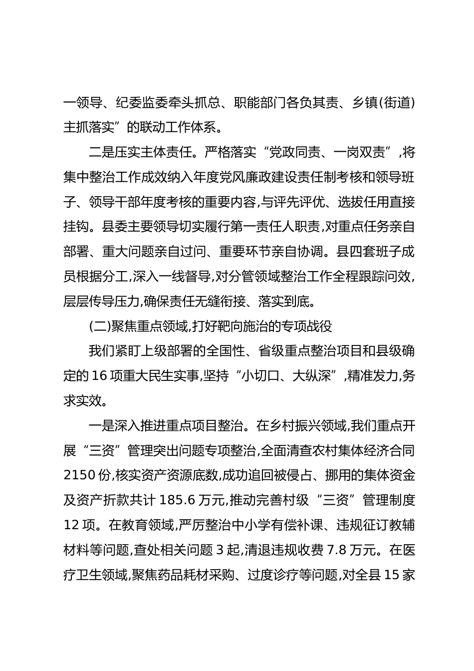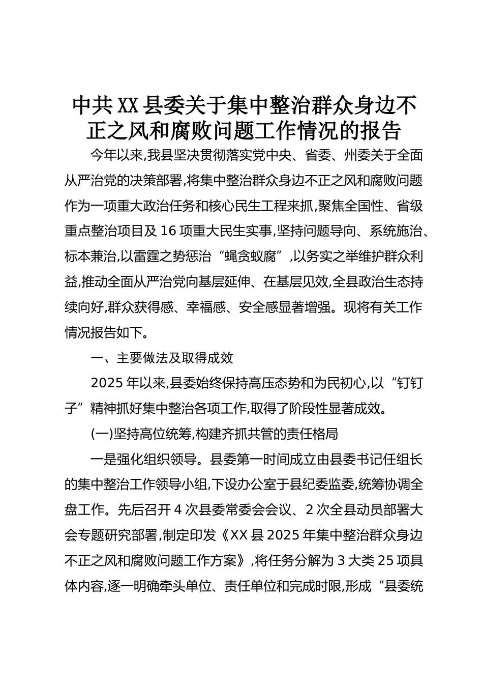 中共XX縣委關(guān)于集中整治群眾身邊不正之風(fēng)和腐敗問題工作情況的報告今年以來,我縣堅決貫徹落實黨中央、省委、州委關(guān)于全面從嚴(yán)治黨的決策部署,將集中整治群眾身邊不正之風(fēng)和腐敗問題作為一項重大政治任務(wù)和核心民生工程來抓,聚焦全國性、省級重點整治項目及16項重大民生實事,堅持問題導(dǎo)向、系統(tǒng)施治、標(biāo)本兼治,以雷霆之勢懲治“蠅貪蟻腐”,以務(wù)實之舉維護(hù)群眾利益,推動全面從嚴(yán)治黨向基層延伸、在基層見效,全縣政治生態(tài)持續(xù)向好,群眾獲得感、幸福感、安全感顯著增強?,F(xiàn)將有關(guān)工作情況報告如下。一、主要做法及取得成效2025年以來,縣委始終保持高壓態(tài)勢和為民初心,以“釘...