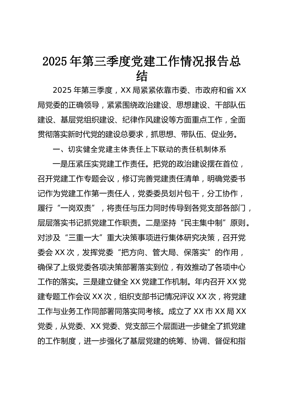2025年第三季度黨建工作情況報(bào)告總結(jié)2025年第三季度,XX局緊緊依靠市委、市政府和省XX局黨委的正確領(lǐng)導(dǎo),緊緊圍繞政治建設(shè)、思想建設(shè)、干部隊(duì)伍建設(shè)、基層黨組織建設(shè)、紀(jì)律作風(fēng)建設(shè)等方面重點(diǎn)工作,全面貫徹落實(shí)新時(shí)代黨的建設(shè)總要求,抓思想、帶隊(duì)伍、促業(yè)務(wù)。一、切實(shí)健全黨建主體責(zé)任上下聯(lián)動(dòng)的責(zé)任機(jī)制體系一是壓緊壓實(shí)黨建工作責(zé)任。把黨的政治建設(shè)擺在首位,召開(kāi)黨建工作專(zhuān)題會(huì)議,修訂完善黨建責(zé)任清單,明確黨委書(shū)記作為黨建工作第一責(zé)任人,黨委委員劃片包干,分工協(xié)作,履行“一崗雙責(zé)”,將責(zé)任與壓力同時(shí)傳導(dǎo)到各黨支部各部門(mén),層層落實(shí)書(shū)記抓黨建工作職責(zé)。...