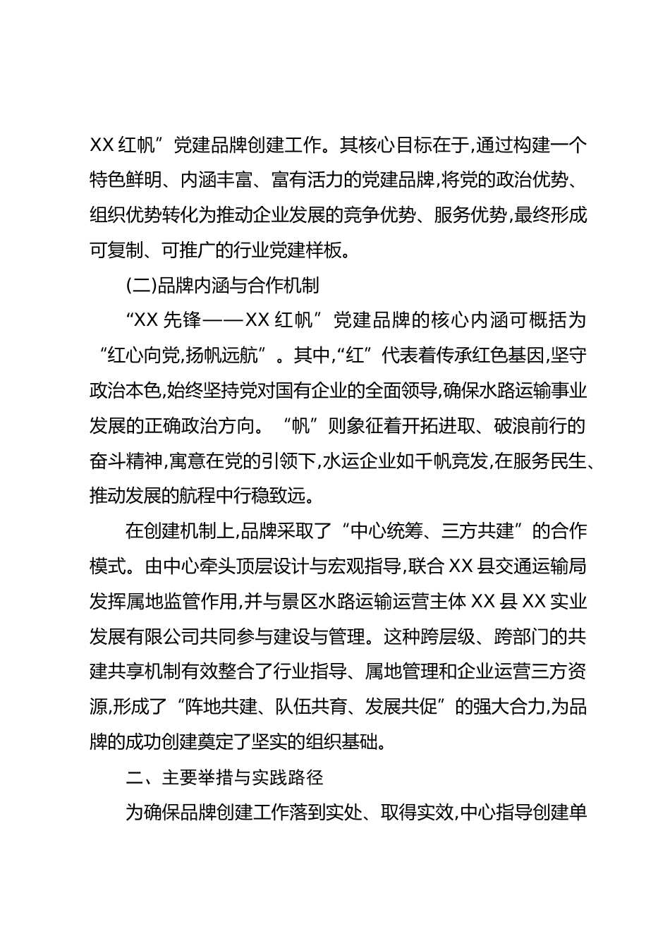 XX市交通運(yùn)輸綜合服務(wù)中心關(guān)于“XX先鋒”黨建品牌創(chuàng)建工作成效的報(bào)告(精品)為深入貫徹新時(shí)代黨的建設(shè)總要求,全面落實(shí)上級(jí)黨委關(guān)于推動(dòng)黨建與業(yè)務(wù)深度融合的決策部署,充分發(fā)揮黨組織在水路運(yùn)輸領(lǐng)域的戰(zhàn)斗堡壘作用和黨員的先鋒模范作用,XX市交通運(yùn)輸綜合服務(wù)中心在省高等級(jí)航道事務(wù)中心的精心指導(dǎo)與市交通運(yùn)輸局的堅(jiān)強(qiáng)領(lǐng)導(dǎo)下,立足行業(yè)實(shí)際,創(chuàng)新工作思路,成功打造了“XX先鋒”黨建品牌,并在XX湖景區(qū)水域率先開展了“XX先鋒——XX紅帆”子品牌創(chuàng)建試點(diǎn)工作。經(jīng)過一段時(shí)間的實(shí)踐探索,品牌創(chuàng)建取得了顯著成效,形成了具有辨識(shí)度和影響力的黨建工作新模式?,F(xiàn)將相關(guān)情況報(bào)告如...