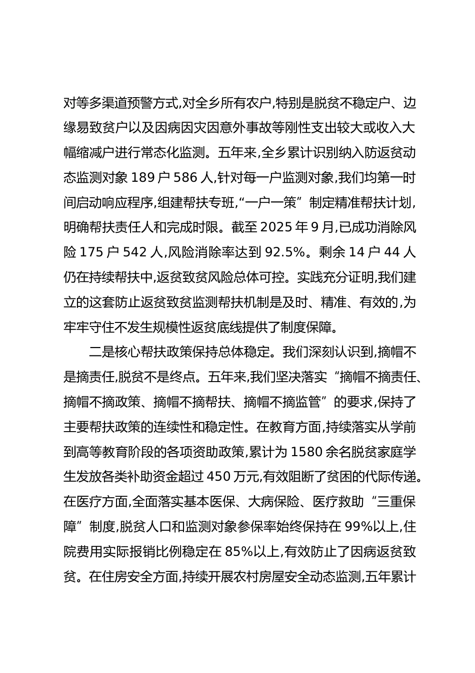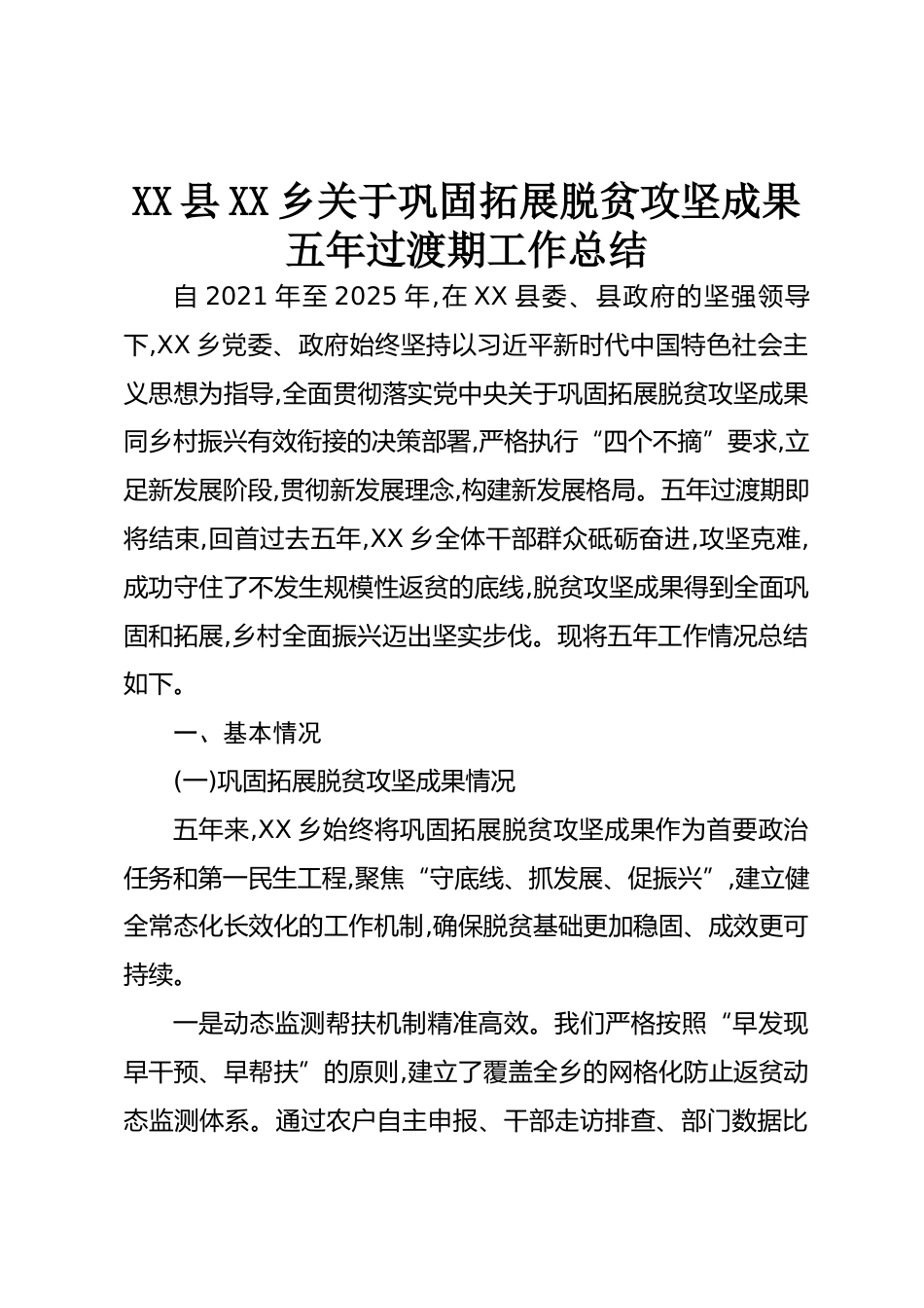 XX縣XX鄉(xiāng)關(guān)于鞏固拓展脫貧攻堅(jiān)成果五年過(guò)渡期工作總結(jié)自2021年至2025年,在XX縣委、縣政府的堅(jiān)強(qiáng)領(lǐng)導(dǎo)下,XX鄉(xiāng)黨委、政府始終堅(jiān)持以習(xí)近平新時(shí)代中國(guó)特色社會(huì)主義思想為指導(dǎo),全面貫徹落實(shí)黨中央關(guān)于鞏固拓展脫貧攻堅(jiān)成果同鄉(xiāng)村振興有效銜接的決策部署,嚴(yán)格執(zhí)行“四個(gè)不摘”要求,立足新發(fā)展階段,貫徹新發(fā)展理念,構(gòu)建新發(fā)展格局。五年過(guò)渡期即將結(jié)束,回首過(guò)去五年,XX鄉(xiāng)全體干部群眾砥礪奮進(jìn),攻堅(jiān)克難,成功守住了不發(fā)生規(guī)模性返貧的底線(xiàn),脫貧攻堅(jiān)成果得到全面鞏固和拓展,鄉(xiāng)村全面振興邁出堅(jiān)實(shí)步伐。現(xiàn)將五年工作情況總結(jié)如下。一、基本情況(一)鞏固拓展脫貧攻堅(jiān)成果情況五年來(lái),...