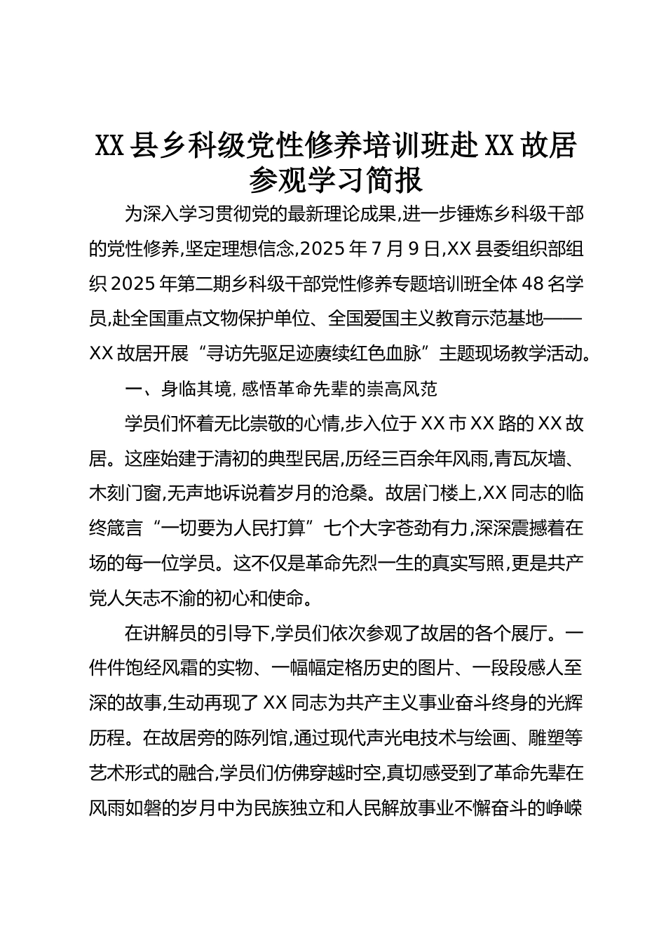 XX縣鄉(xiāng)科級(jí)黨性修養(yǎng)培訓(xùn)班赴XX故居參觀學(xué)習(xí)簡(jiǎn)報(bào)為深入學(xué)習(xí)貫徹黨的最新理論成果,進(jìn)一步錘煉鄉(xiāng)科級(jí)干部的黨性修養(yǎng),堅(jiān)定理想信念,2025年7月9日,XX縣委組織部組織2025年第二期鄉(xiāng)科級(jí)干部黨性修養(yǎng)專題培訓(xùn)班全體48名學(xué)員,赴全國(guó)重點(diǎn)文物保護(hù)單位、全國(guó)愛國(guó)主義教育示范基地——XX故居開展“尋訪先驅(qū)足跡賡續(xù)紅色血脈”主題現(xiàn)場(chǎng)教學(xué)活動(dòng)。一、身臨其境,感悟革命先輩的崇高風(fēng)范學(xué)員們懷著無比崇敬的心情,步入位于XX市XX路的XX故居。這座始建于清初的典型民居,歷經(jīng)三百余年風(fēng)雨,青瓦灰墻、木刻門窗,無聲地訴說著歲月的滄桑。故居門樓上,XX同志的臨終箴言“一切要為人民打算”七...