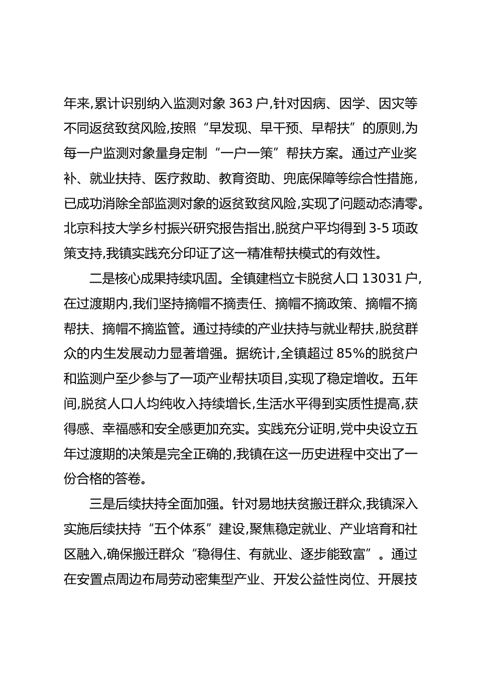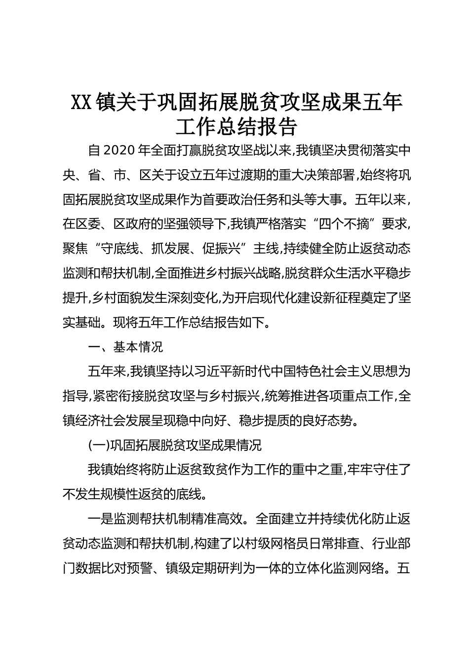 XX鎮(zhèn)關(guān)于鞏固拓展脫貧攻堅(jiān)成果五年工作總結(jié)報(bào)告自2020年全面打贏脫貧攻堅(jiān)戰(zhàn)以來(lái),我鎮(zhèn)堅(jiān)決貫徹落實(shí)中央、省、市、區(qū)關(guān)于設(shè)立五年過(guò)渡期的重大決策部署,始終將鞏固拓展脫貧攻堅(jiān)成果作為首要政治任務(wù)和頭等大事。五年以來(lái),在區(qū)委、區(qū)政府的堅(jiān)強(qiáng)領(lǐng)導(dǎo)下,我鎮(zhèn)嚴(yán)格落實(shí)“四個(gè)不摘”要求,聚焦“守底線、抓發(fā)展、促振興”主線,持續(xù)健全防止返貧動(dòng)態(tài)監(jiān)測(cè)和幫扶機(jī)制,全面推進(jìn)鄉(xiāng)村振興戰(zhàn)略,脫貧群眾生活水平穩(wěn)步提升,鄉(xiāng)村面貌發(fā)生深刻變化,為開(kāi)啟現(xiàn)代化建設(shè)新征程奠定了堅(jiān)實(shí)基礎(chǔ)?,F(xiàn)將五年工作總結(jié)報(bào)告如下。一、基本情況五年來(lái),我鎮(zhèn)堅(jiān)持以習(xí)近平新時(shí)代中國(guó)特色社會(huì)主義思想為指導(dǎo),緊...