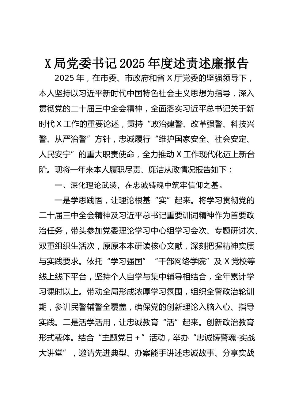 X局黨委書記2025年度述責(zé)述廉報(bào)告2025年,在市委、市政府和省X廳黨委的堅(jiān)強(qiáng)領(lǐng)導(dǎo)下,本人堅(jiān)持以習(xí)近平新時(shí)代中國特色社會(huì)主義思想為指導(dǎo),深入貫徹黨的二十屆三中全會(huì)精神,全面落實(shí)習(xí)近平總書記關(guān)于新時(shí)代X工作的重要論述,秉持“政治建警、改革強(qiáng)警、科技興警、從嚴(yán)治警”方針,忠誠履行“維護(hù)國家安全、社會(huì)安定、人民安寧”的重大職責(zé)使命,全力推動(dòng)X工作現(xiàn)代化邁上新臺(tái)階?,F(xiàn)將一年來本人履職盡責(zé)、廉潔從政情況報(bào)告如下:一、深化理論武裝,在忠誠鑄魂中筑牢信仰之基。一是學(xué)思踐悟,讓理論根基“實(shí)”起來。將學(xué)習(xí)貫徹黨的二十屆三中全會(huì)精神及習(xí)近平總書記重要訓(xùn)詞...