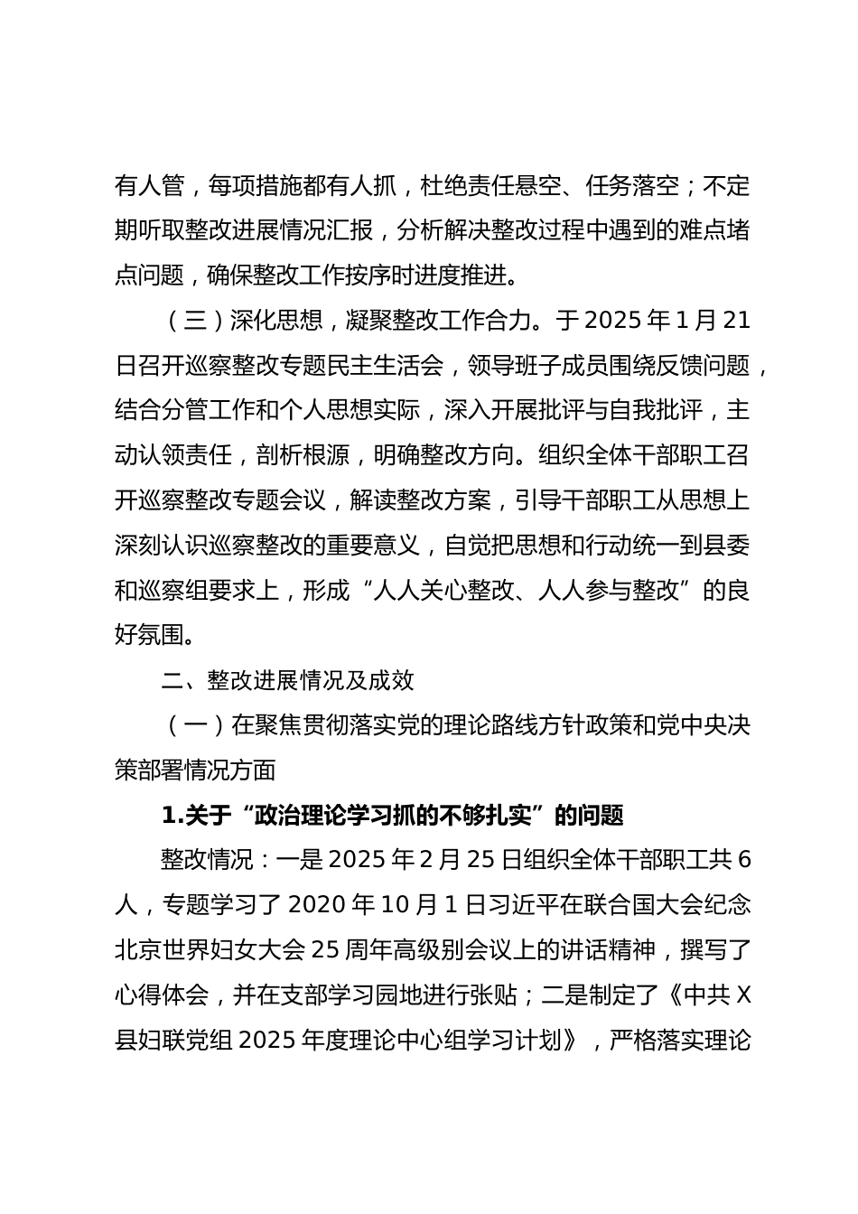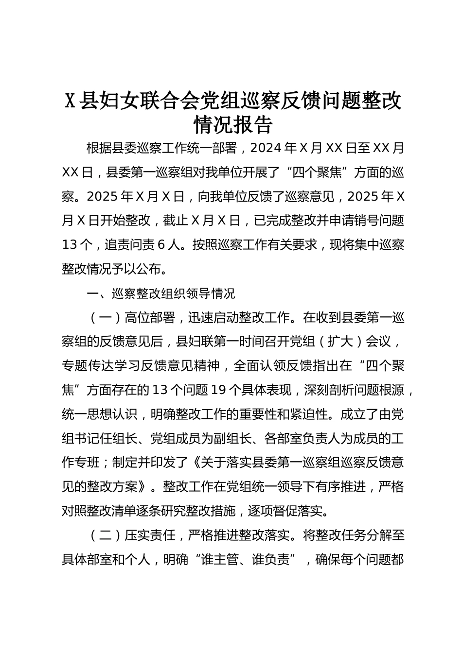 X縣婦女聯(lián)合會(huì)黨組巡察反饋問(wèn)題整改情況報(bào)告根據(jù)縣委巡察工作統(tǒng)一部署,2024年X月XX日至XX月XX日,縣委第一巡察組對(duì)我單位開(kāi)展了“四個(gè)聚焦”方面的巡察。2025年X月X日,向我單位反饋了巡察意見(jiàn),2025年X月X日開(kāi)始整改,截止X月X日,已完成整改并申請(qǐng)銷號(hào)問(wèn)題13個(gè),追責(zé)問(wèn)責(zé)6人。按照巡察工作有關(guān)要求,現(xiàn)將集中巡察整改情況予以公布。一、巡察整改組織領(lǐng)導(dǎo)情況(一)高位部署,迅速啟動(dòng)整改工作。在收到縣委第一巡察組的反饋意見(jiàn)后,縣婦聯(lián)第一時(shí)間召開(kāi)黨組(擴(kuò)大)會(huì)議,專題傳達(dá)學(xué)習(xí)反饋意見(jiàn)精神,全面認(rèn)領(lǐng)反饋指出在“四個(gè)聚焦”方面存在的13個(gè)問(wèn)題19個(gè)具體表現(xiàn),深...