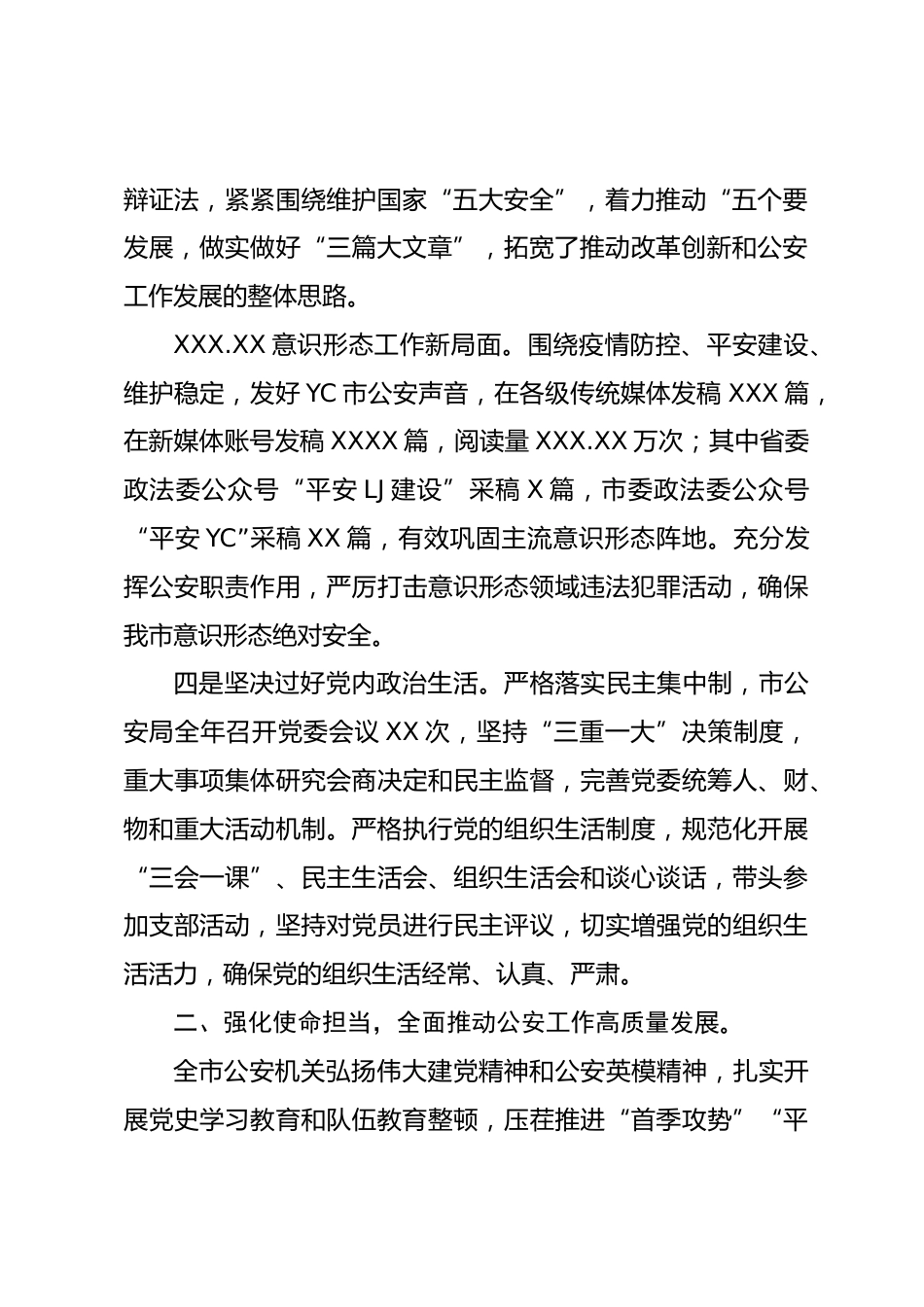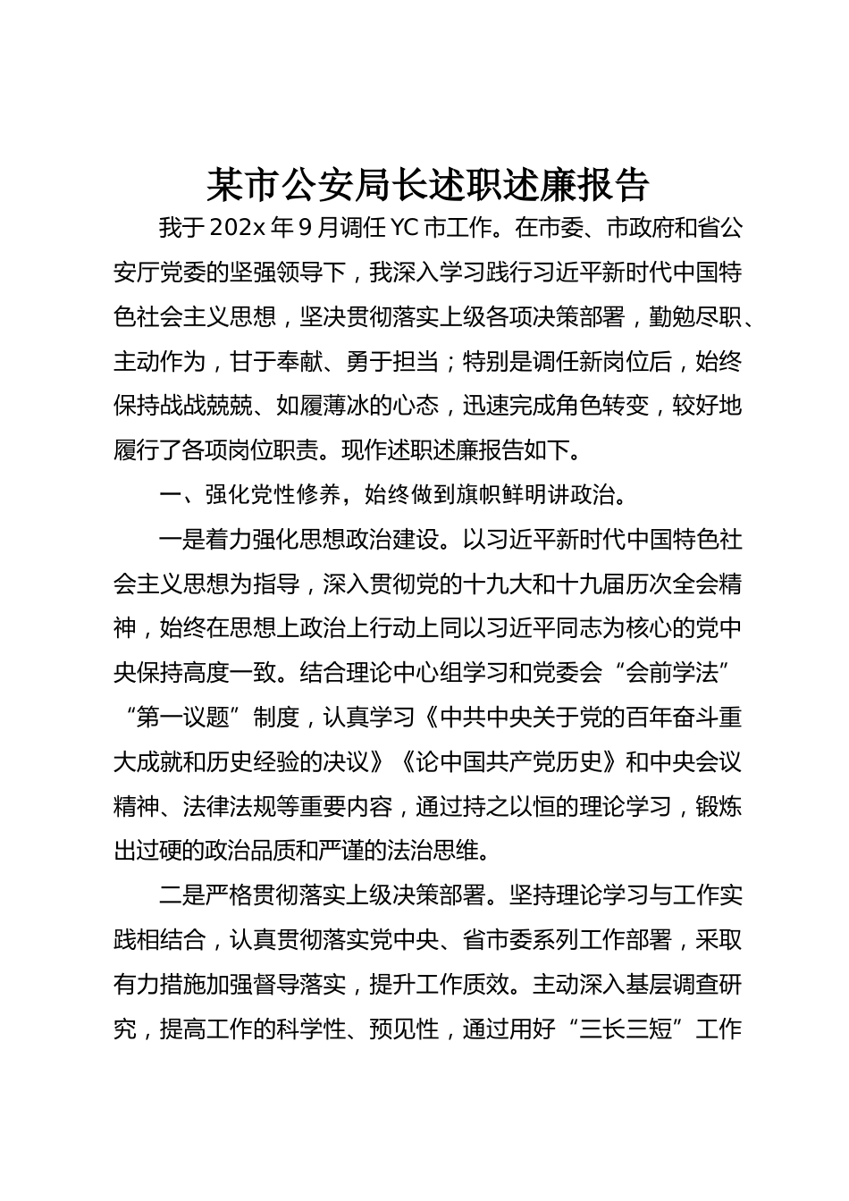 某市公安局長述職述廉報告我于202x年9月調(diào)任YC市工作。在市委、市政府和省公安廳黨委的堅強(qiáng)領(lǐng)導(dǎo)下,我深入學(xué)習(xí)踐行習(xí)近平新時代中國特色社會主義思想,堅決貫徹落實上級各項決策部署,勤勉盡職、主動作為,甘于奉獻(xiàn)、勇于擔(dān)當(dāng);特別是調(diào)任新崗位后,始終保持戰(zhàn)戰(zhàn)兢兢、如履薄冰的心態(tài),迅速完成角色轉(zhuǎn)變,較好地履行了各項崗位職責(zé)。現(xiàn)作述職述廉報告如下。一、強(qiáng)化黨性修養(yǎng),始終做到旗幟鮮明講政治。一是著力強(qiáng)化思想政治建設(shè)。以習(xí)近平新時代中國特色社會主義思想為指導(dǎo),深入貫徹黨的十九大和十九屆歷次全會精神,始終在思想上政治上行動上同以習(xí)近平同志為核心的黨...