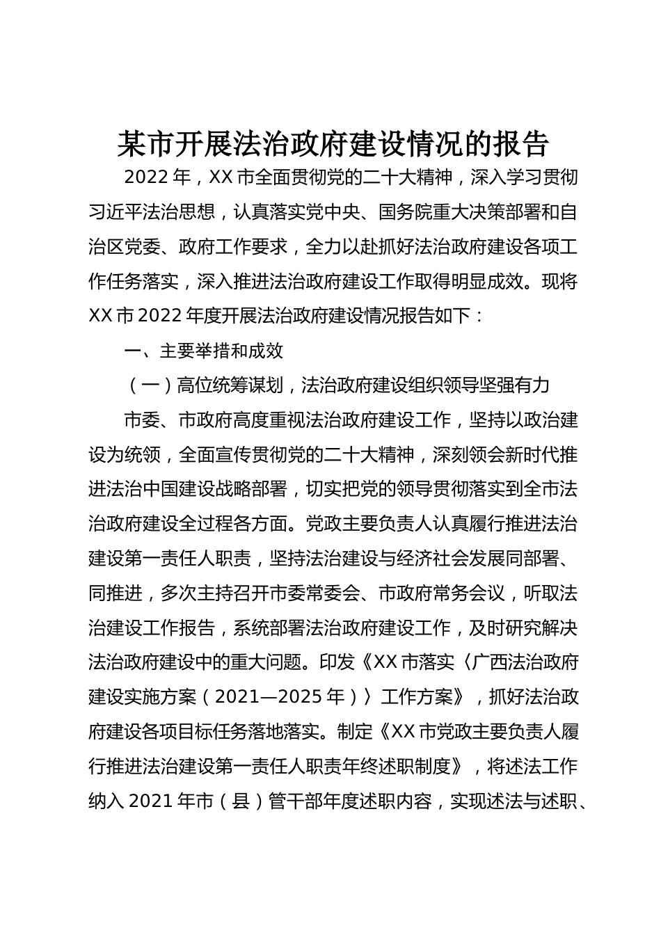某市開展法治政府建設(shè)情況的報(bào)告2022年,XX市全面貫徹黨的二十大精神,深入學(xué)習(xí)貫徹習(xí)近平法治思想,認(rèn)真落實(shí)黨中央、國(guó)務(wù)院重大決策部署和自治區(qū)黨委、政府工作要求,全力以赴抓好法治政府建設(shè)各項(xiàng)工作任務(wù)落實(shí),深入推進(jìn)法治政府建設(shè)工作取得明顯成效。現(xiàn)將XX市2022年度開展法治政府建設(shè)情況報(bào)告如下:一、主要舉措和成效(一)高位統(tǒng)籌謀劃,法治政府建設(shè)組織領(lǐng)導(dǎo)堅(jiān)強(qiáng)有力市委、市政府高度重視法治政府建設(shè)工作,堅(jiān)持以政治建設(shè)為統(tǒng)領(lǐng),全面宣傳貫徹黨的二十大精神,深刻領(lǐng)會(huì)新時(shí)代推進(jìn)法治中國(guó)建設(shè)戰(zhàn)略部署,切實(shí)把黨的領(lǐng)導(dǎo)貫徹落實(shí)到全市法治政府建設(shè)全過程各方面。...