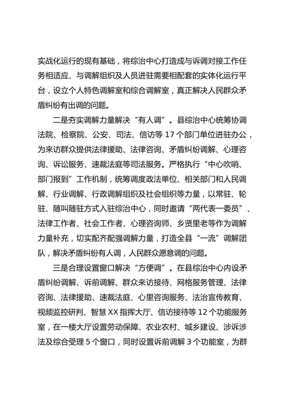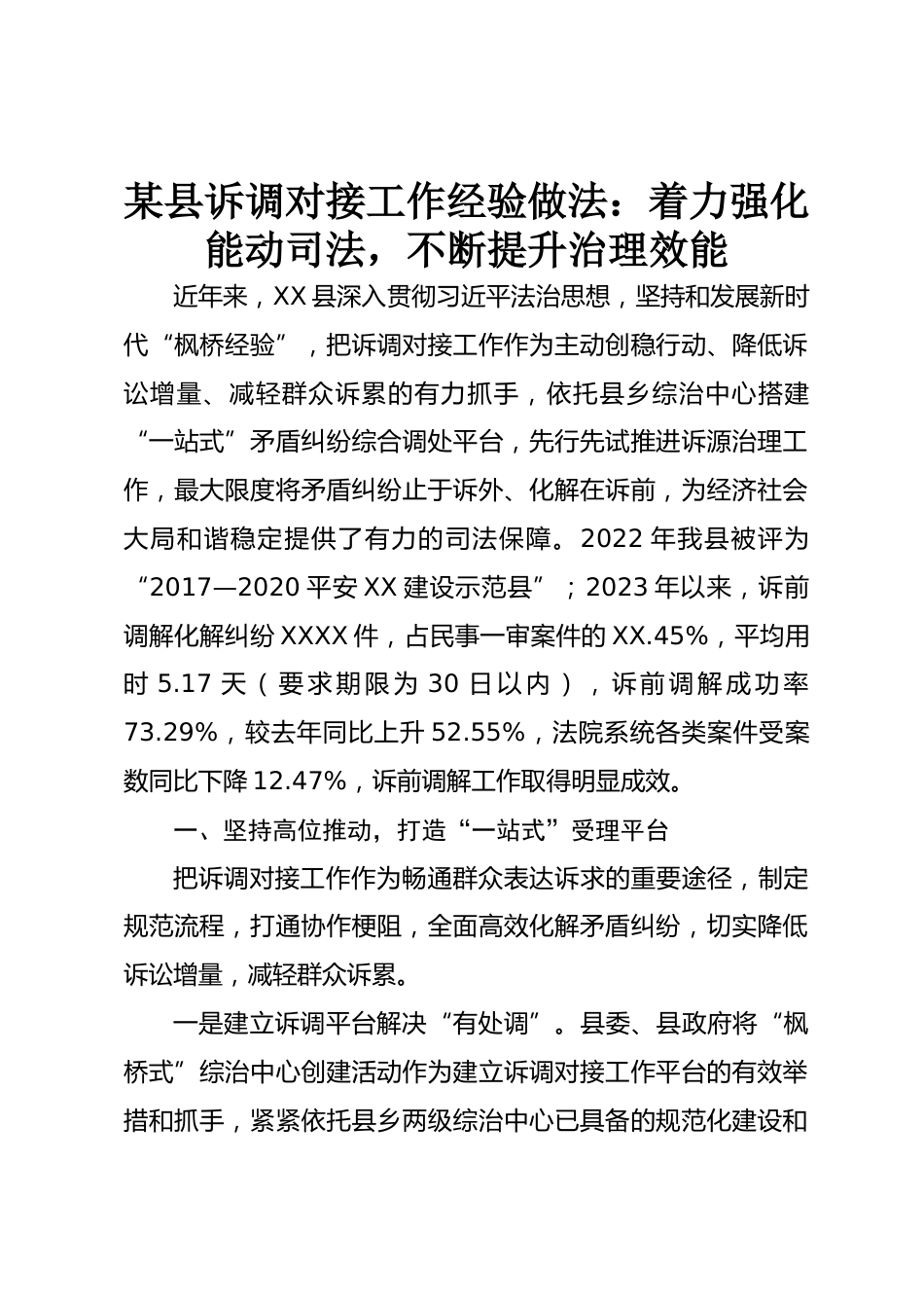 某縣訴調(diào)對(duì)接工作經(jīng)驗(yàn)做法:著力強(qiáng)化能動(dòng)司法,不斷提升治理效能近年來(lái),XX縣深入貫徹習(xí)近平法治思想,堅(jiān)持和發(fā)展新時(shí)代“楓橋經(jīng)驗(yàn)”,把訴調(diào)對(duì)接工作作為主動(dòng)創(chuàng)穩(wěn)行動(dòng)、降低訴訟增量、減輕群眾訴累的有力抓手,依托縣鄉(xiāng)綜治中心搭建“一站式”矛盾糾紛綜合調(diào)處平臺(tái),先行先試推進(jìn)訴源治理工作,最大限度將矛盾糾紛止于訴外、化解在訴前,為經(jīng)濟(jì)社會(huì)大局和諧穩(wěn)定提供了有力的司法保障。2022年我縣被評(píng)為“2017—2020平安XX建設(shè)示范縣”;2023年以來(lái),訴前調(diào)解化解糾紛XXXX件,占民事一審案件的XX.45%,平均用時(shí)5.17天(要求期限為30日以內(nèi)),訴前調(diào)解成功率73.29%,較去...