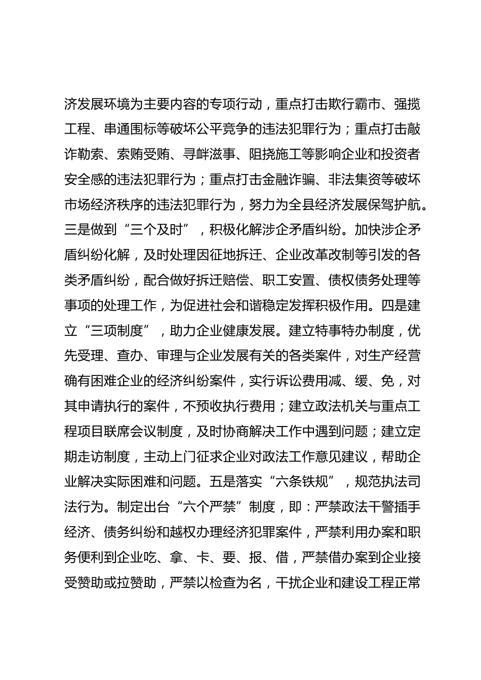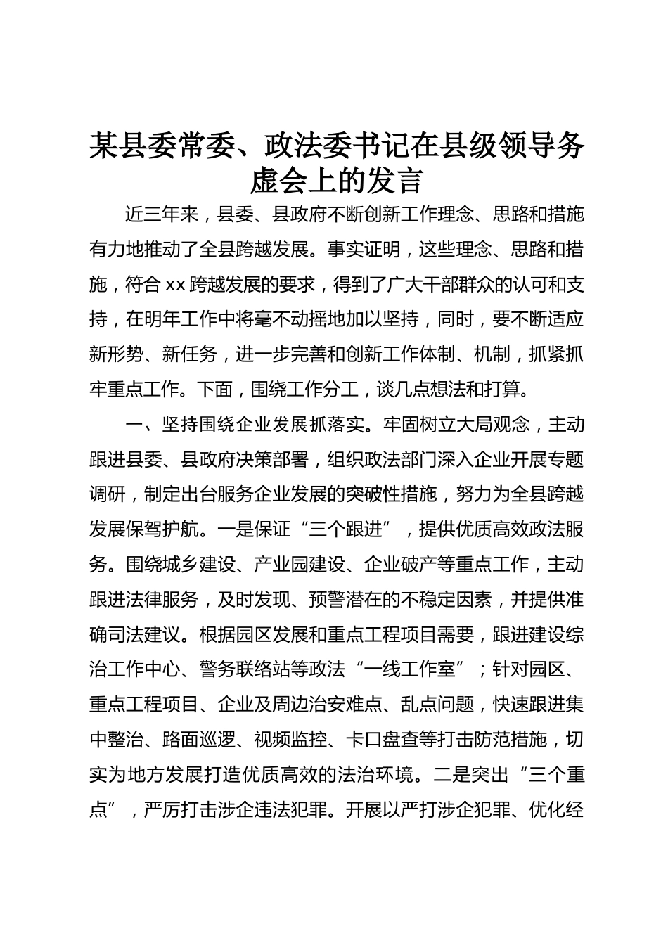 某縣委常委、政法委書記在縣級領導務虛會上的發(fā)言近三年來,縣委、縣政府不斷創(chuàng)新工作理念、思路和措施有力地推動了全縣跨越發(fā)展。事實證明,這些理念、思路和措施,符合xx跨越發(fā)展的要求,得到了廣大干部群眾的認可和支持,在明年工作中將毫不動搖地加以堅持,同時,要不斷適應新形勢、新任務,進一步完善和創(chuàng)新工作體制、機制,抓緊抓牢重點工作。下面,圍繞工作分工,談幾點想法和打算。一、堅持圍繞企業(yè)發(fā)展抓落實。牢固樹立大局觀念,主動跟進縣委、縣政府決策部署,組織政法部門深入企業(yè)開展專題調研,制定出臺服務企業(yè)發(fā)展的突破性措施,努力為全縣跨越發(fā)展保駕護...